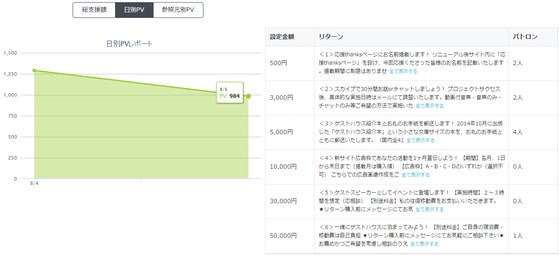 やはり今のところ真ん中の価格である5000円の伸びが大きいようです。5000円のリターンは「ゲストハウス紹介本とお礼のお手紙を郵送します!」というもので、6つの中で唯一”形ある物”が郵送されてくるリターンです。また、前職の飲食広告の際にも体感したのですが、やはり真ん中の価格(松竹梅でいう”竹”の価格)はお選びいただきやすいということも関係あるのかなと思います。