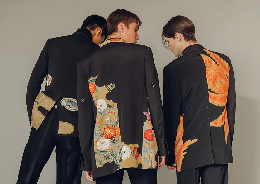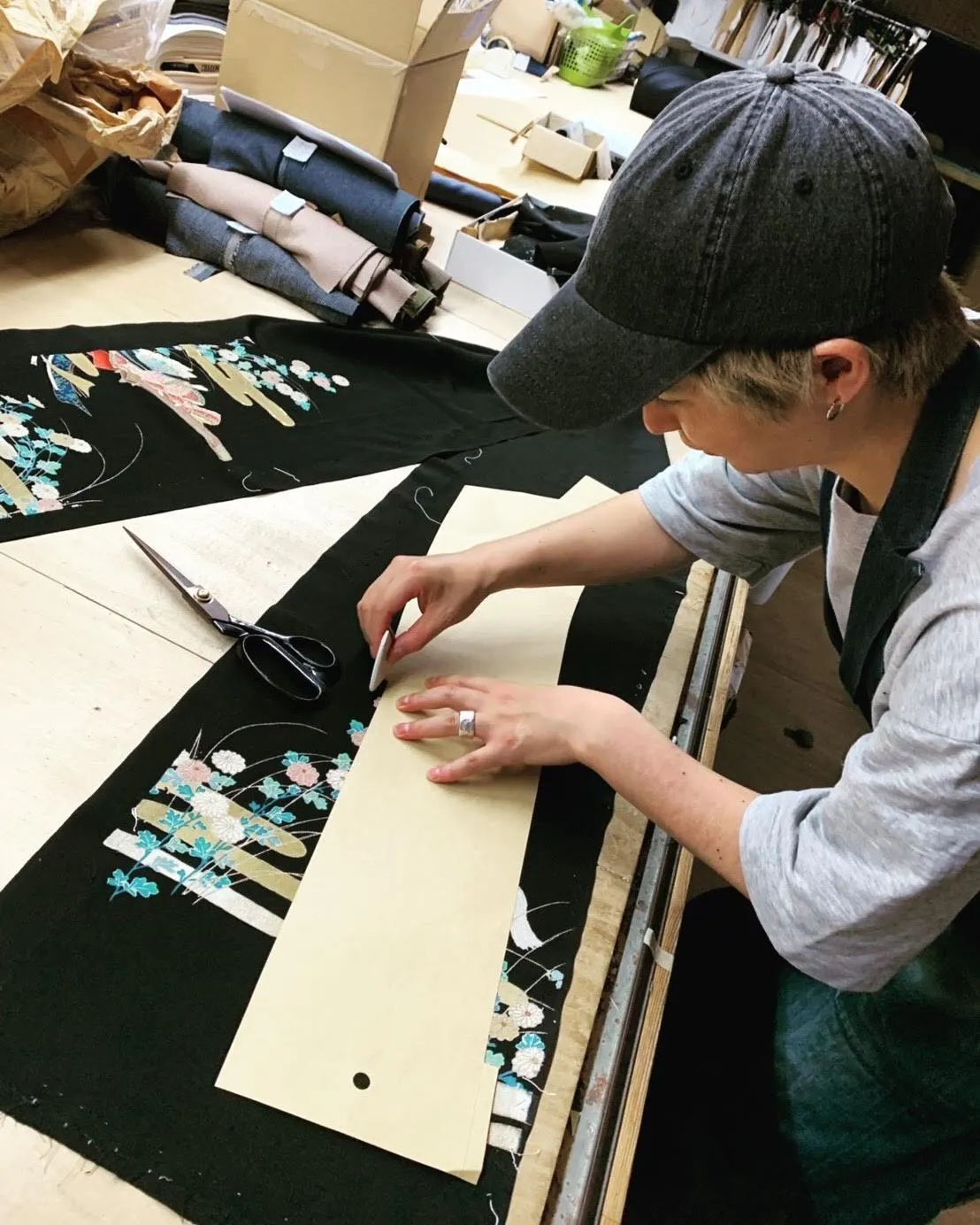 日本の和の象徴である着物を解体したものをテーラーのカッターが柄を活かし裁断。