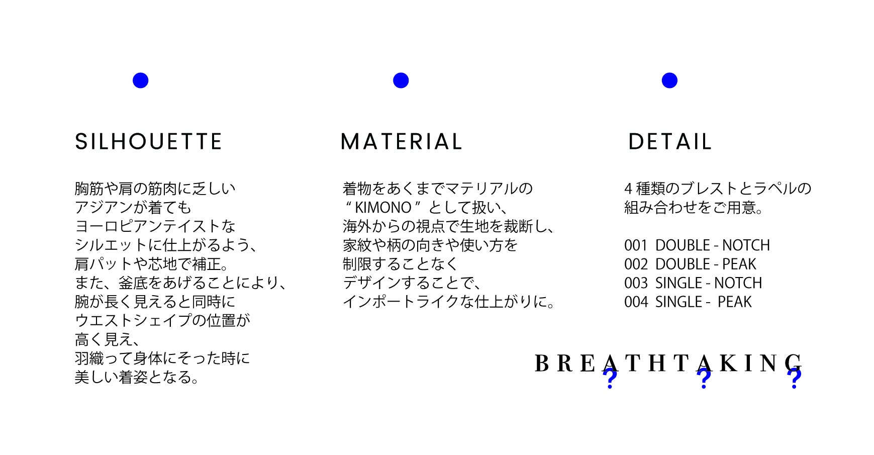 この BREATHTAKING × テーラード職人が生み出すフィッティングのよいジャケットやスラックスのシルエットは、ELIXIR KIMONO JACKET だけでなく、BREATHTAKINGの誇るドレスラインの象徴とも言えます。