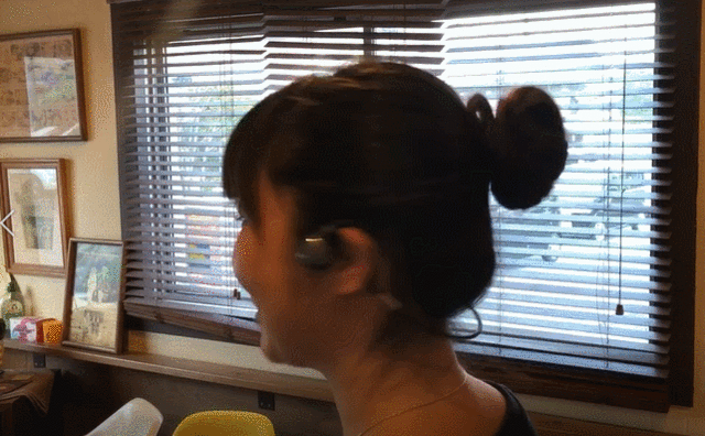装着はヘッドホンのフレーム部分を後ろから耳に引っ掛けるようにし、スピーカー部が耳とこめかみの間ぐらいに当たるようにセットします。