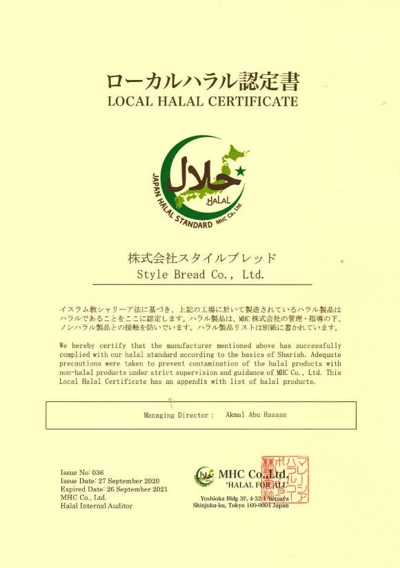 日本でも食のグローバル化が加速し、ハラル対応へのニーズが高まっている中、2018年9月25日にマレーシア ハラル コーポレーション株式会社所管のローカルハラル認証を取得しました。国産小麦100%のオリジナルブレンドを主に使用しており、ナチュラルな素材故に、ハラル認証を取得することができました。