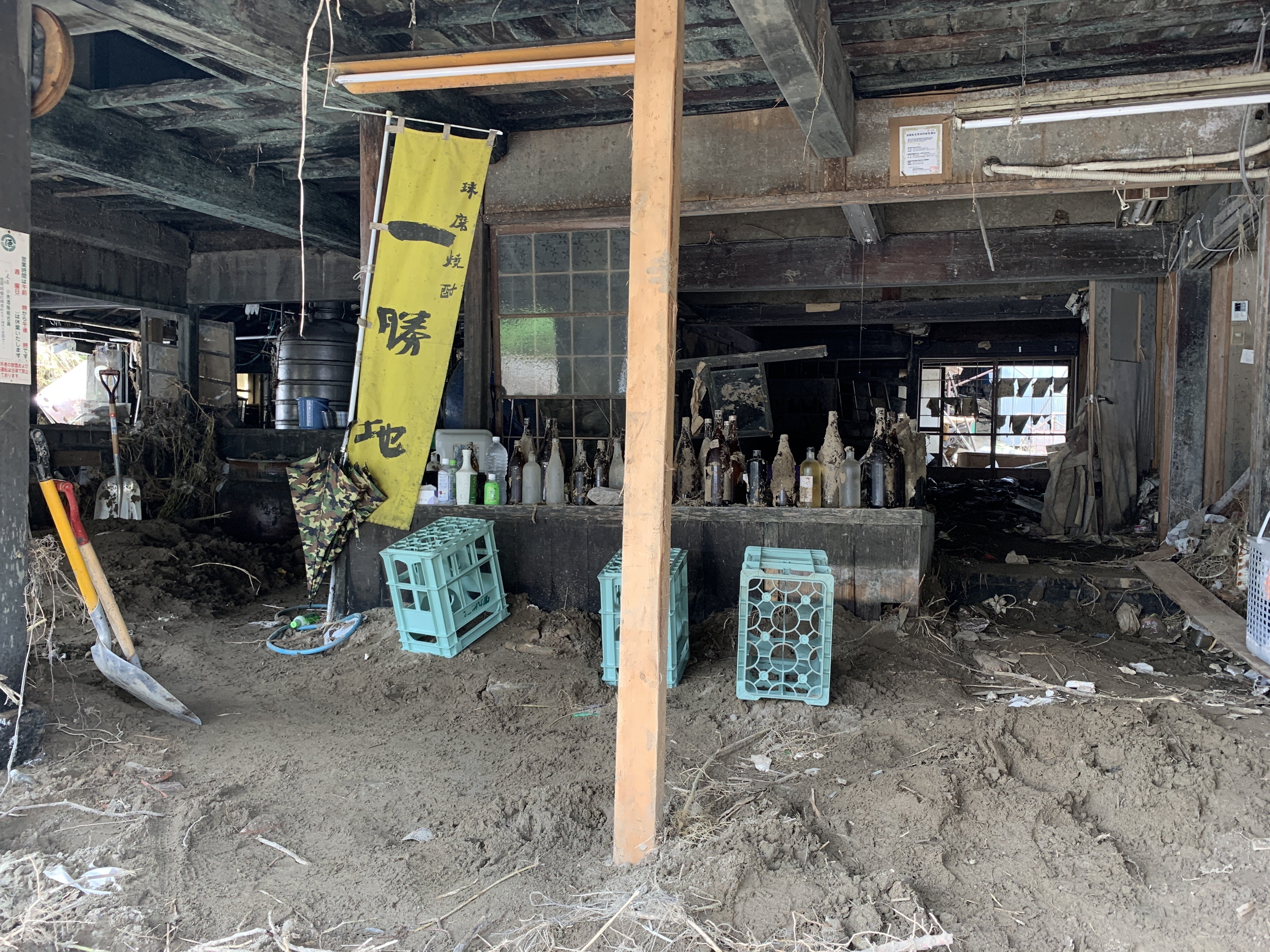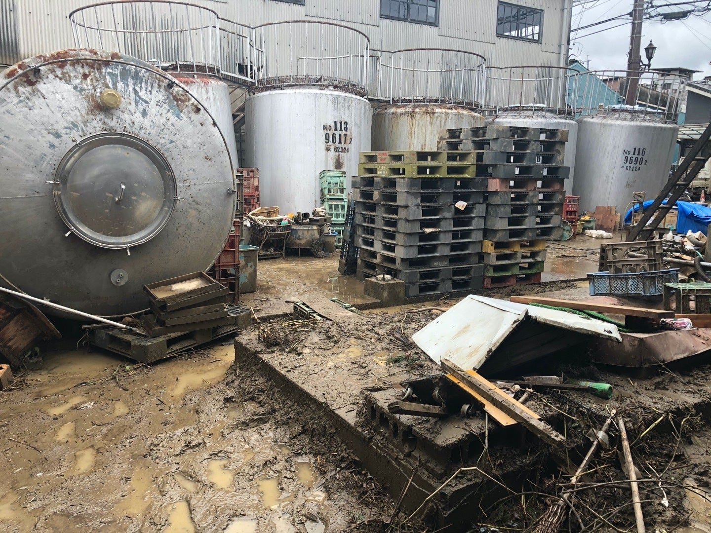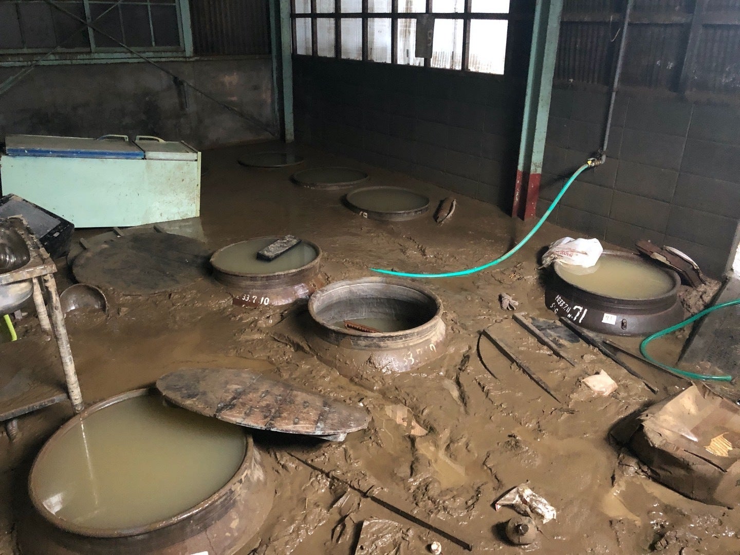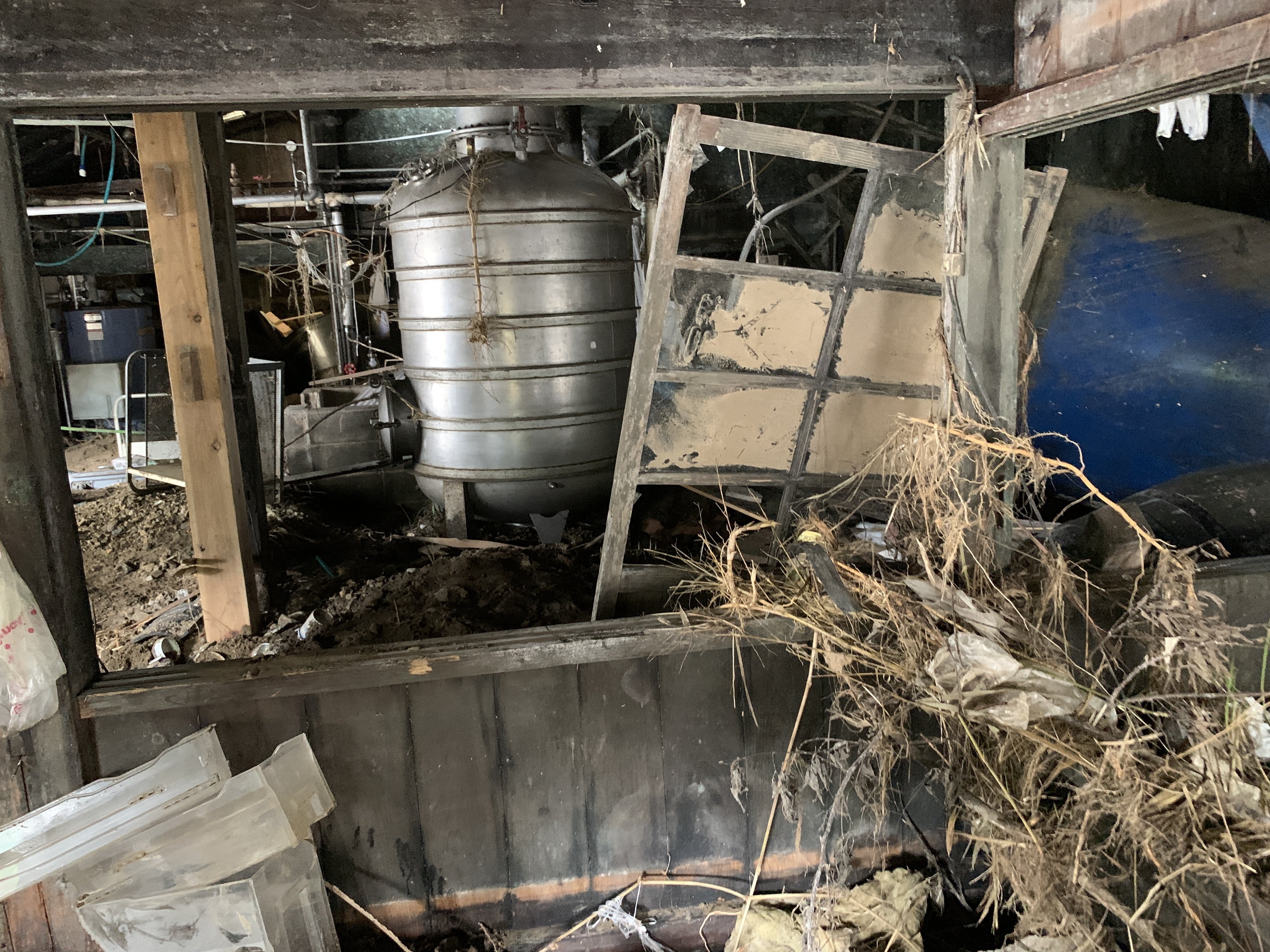 2階まで浸水し、泥が室内まで入り込み、仕込みタンクは倒壊し。貯蔵焼酎はすべて流出し、すべての機器が破損しました。蔵元の方々も「もうダメかもしれない」「復興に10億かかる」「一つの蔵元とでは立ち上がれない」など弱気な言葉ばかり・・・