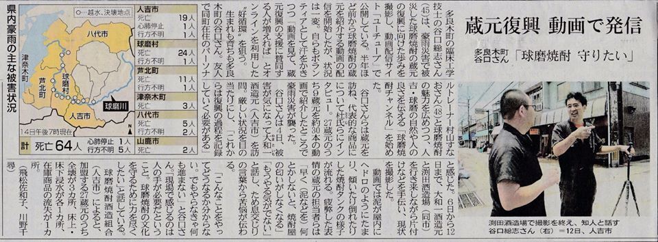 はじめまして。クラウドファンディング企画・運営者の谷口総志(45)、村山直(49)です。我々は球磨焼酎の魅力を伝える番組、球磨焼酎チャンネル(YouTube)を行っています。半年ほど前に開設したチャンネルで現在まで9カ所の蔵元を取材させていただきました。「焼酎って奥が深い、うまい。さぁ、これからだ!」というときに九州豪雨により球磨川が氾濫しました。