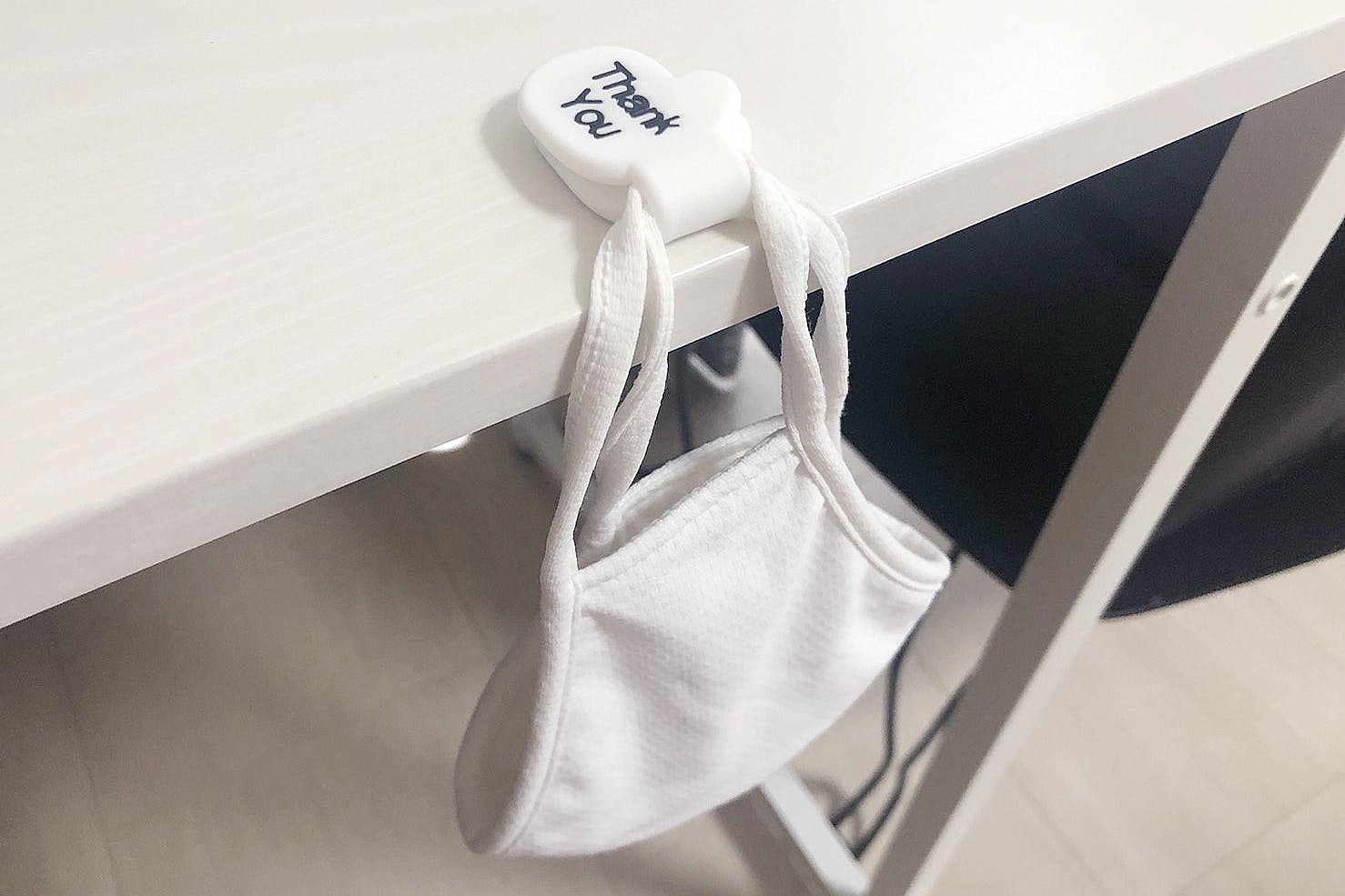 マスクの紐をマスクマグネットに挟んで、机にぶら下げて使うこともできます。