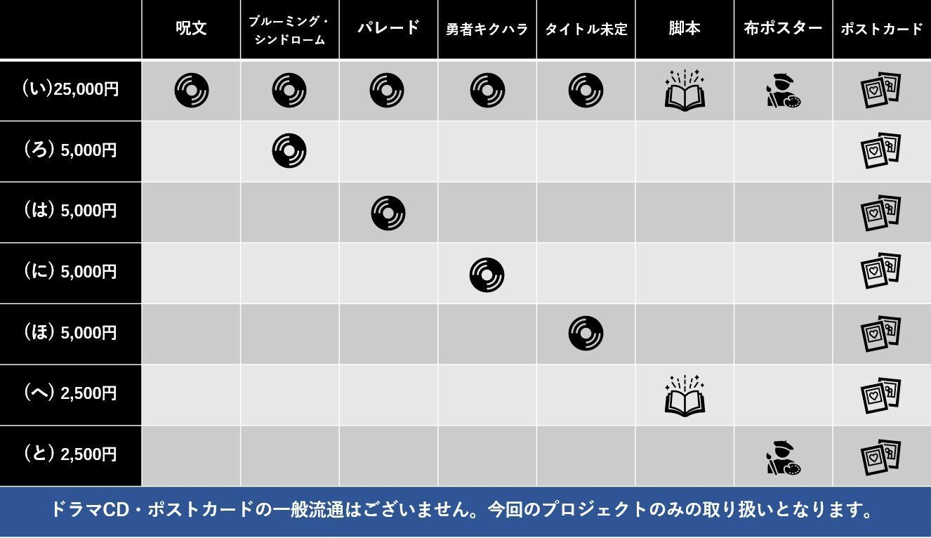 A:各ドラマCD、ポストカード2種はCAMPFIREのみの完全受注限定生産です。後日、店舗や通販等での一般流通はいたしません。脚本、キービジュアルB2布ポスターは、後日通販サイトにて各2,500円で販売いたします。