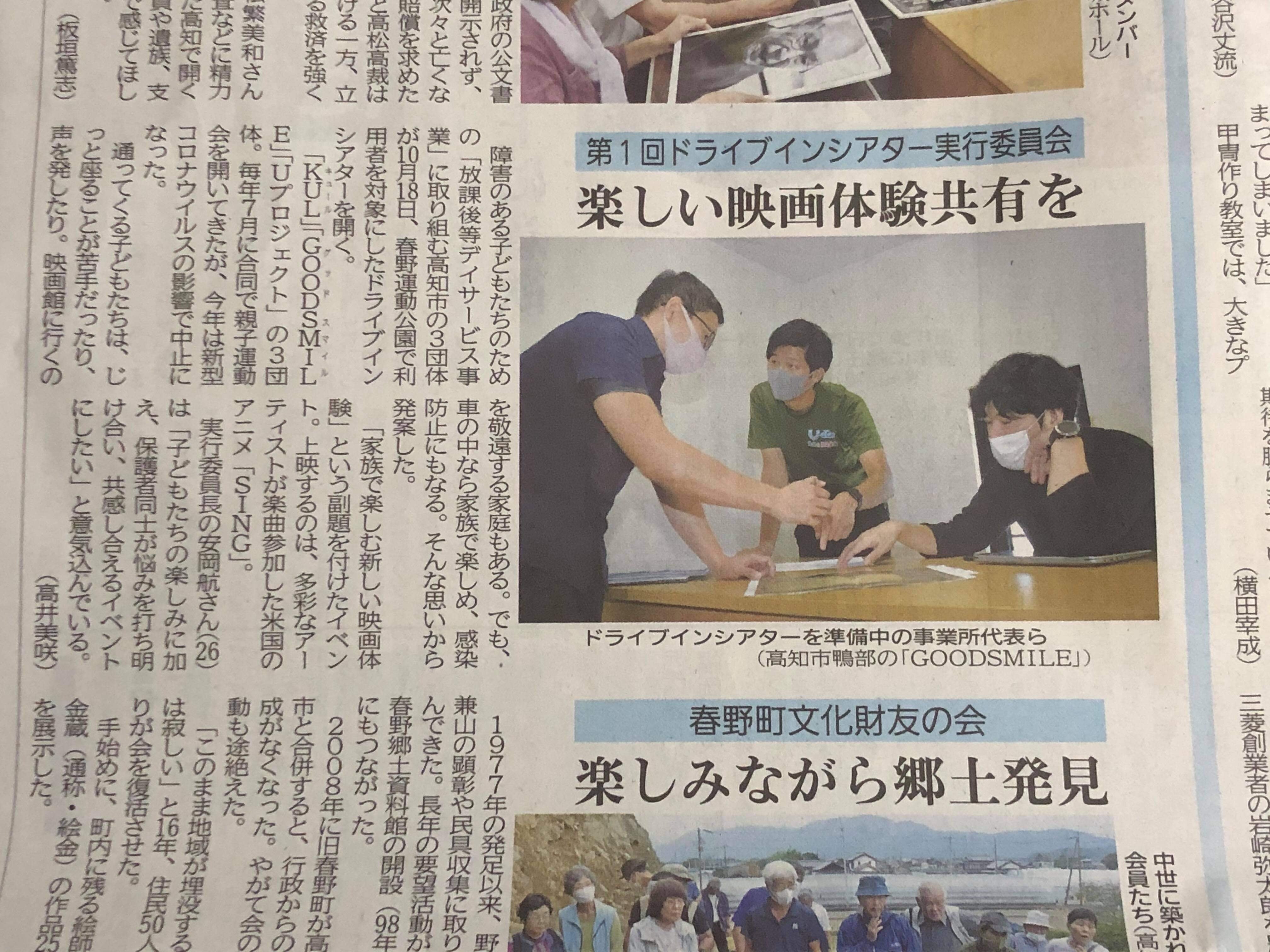 今回ドライブインシアターを開催するにあたり、クラウドファンディングと合わせて高知新聞厚生文化事業団が行う厚生文化事業金銭助成へ申し込みをしており、申込書と合わせ企画書や予算書を提出させていただいた結果、無事採用される事となりました。上記と合わせ、イベントについての取材も行っていただき更なる広がりへと繋がっております。※9月30日の朝刊にて掲載予定となっておりますので、ぜひご覧ください‼