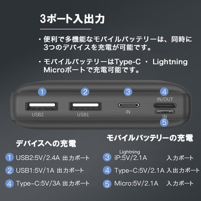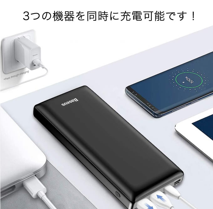 同時に3つのデバイスの充電が可能です。大容量なので余裕を持って充電が出来ます。