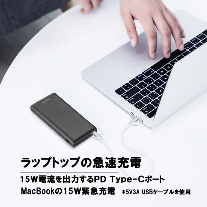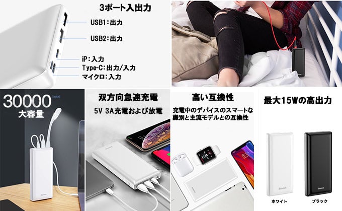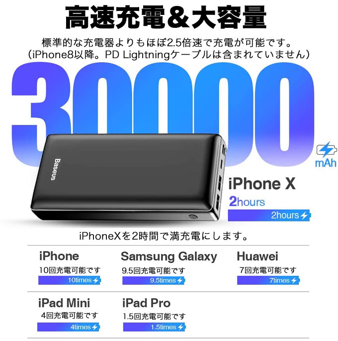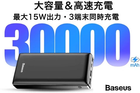 BaseusPowerBankMiniは30,000mAh大容量。最大15W出力でiPhoneやiPad、ゲーム端末、アクションカメラなど日常で使用している端末を何度も充電が可能です。