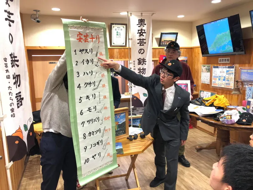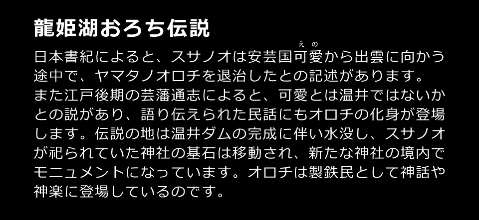 | 温井ダムには「鉄の物語」が眠っており、小学生・高校生・住民が協働して、導水管のモニュメントを「聖地」として活用する取り組みを始めています。加計小学校で民話を読み聞かせ、自由なオロチを図画し、紙芝居作家によって絵本にもなりました。加計高等学校の生徒は、寸劇や人形劇に仕上げて、保育園で演じました。