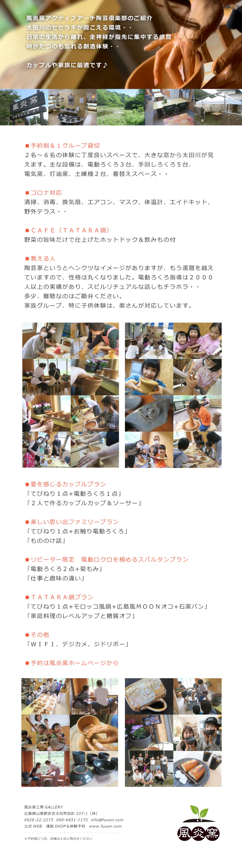陶芸&調理体験 (風炎窯CFリターンチケット利用可・予約は風炎窯HPから)![]() 公式ホームページ 予約はコチラ