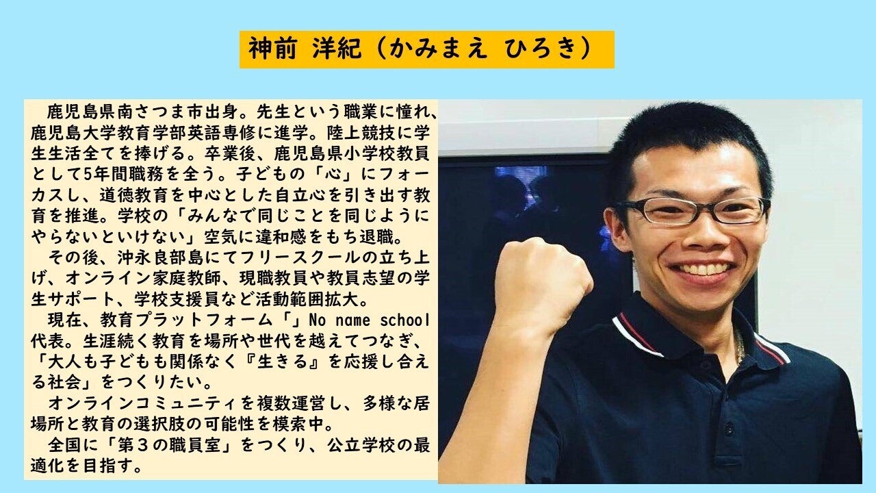 本プロジェクトオーナー、教育プラットフォーム No name school代表、神前洋紀(かみまえひろき)と申します。
