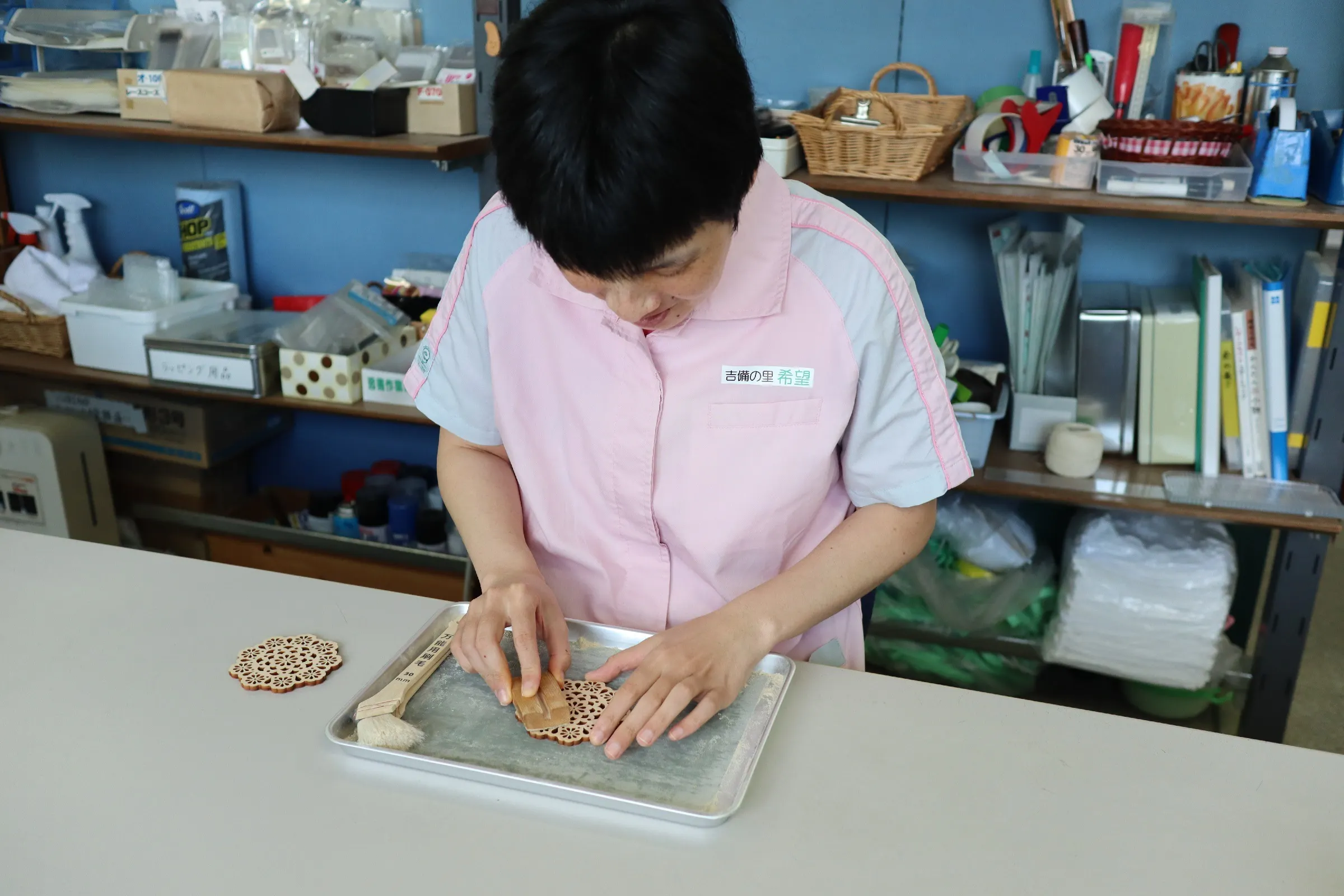 自主製品のひとつに、岡山県産のヒノキ材を使用した木製品を扱っています。木製品をレーザー加工するにあたって、利用者がパソコンスキルを活かし、デザインしています。また、加工した木製品は手作業で丁寧にやすりがけをし、手間をかけて作製しています。