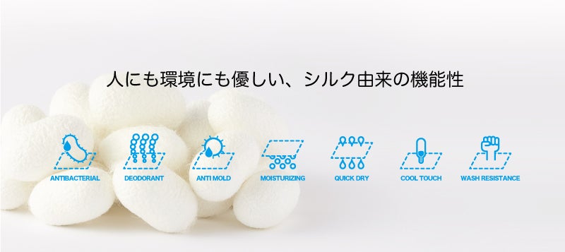 特許技術製法により、シルクが持つ機能性を損なわずに加工の簡易さ、耐洗濯性を実現しました。また、加工する対象繊維は選ばず、ナイロン、ポリエステルなどの合成繊維、綿、レーヨン、ウールなどの天然繊維にも高い効果を発揮します。