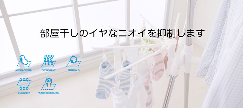 DipSi は未加工綿に比べ、速乾性が約2 倍。乾燥速度の向上により部屋干し時の嫌なニオイの発生を防ぎます。