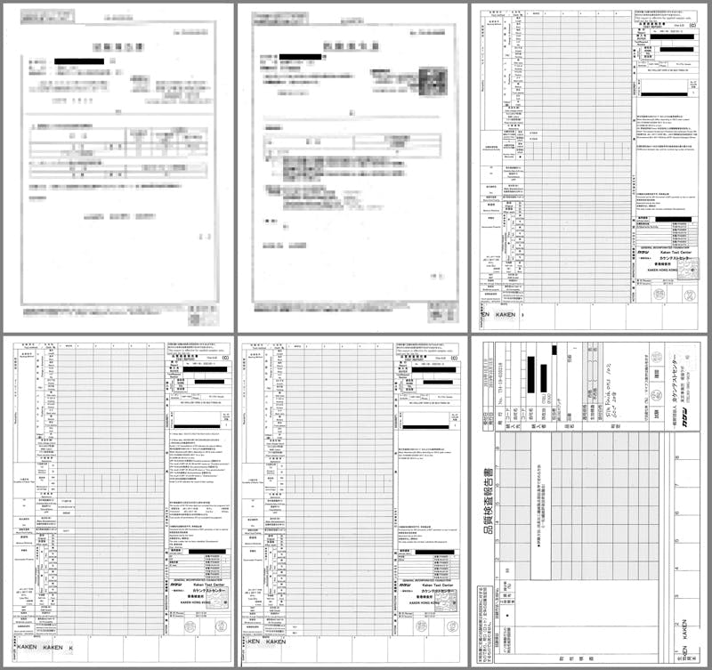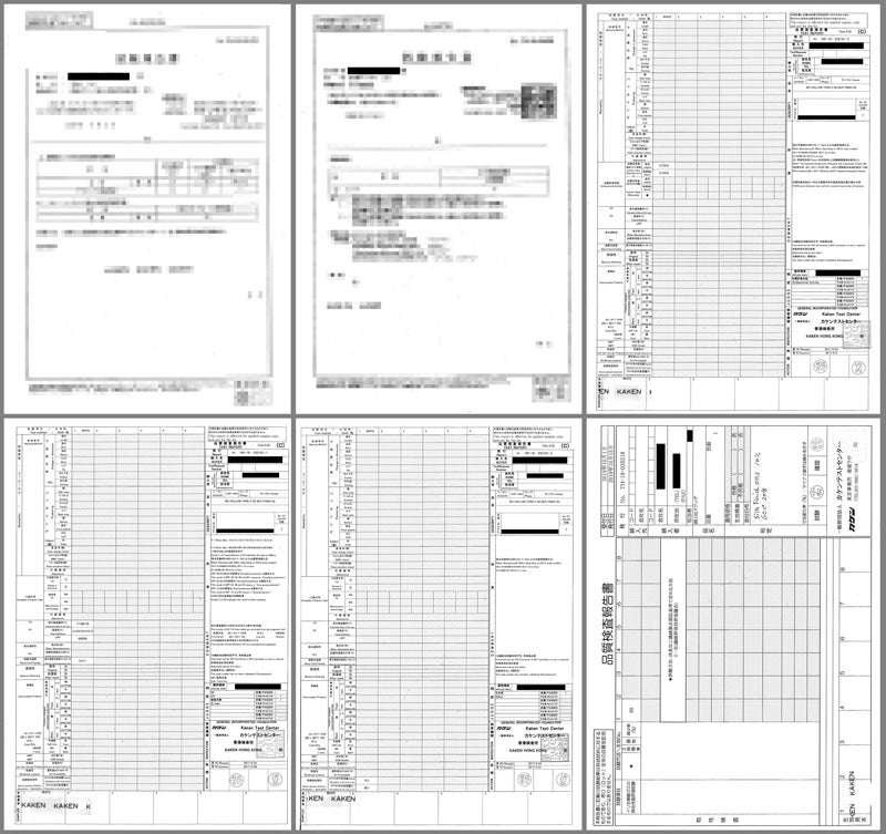 各種試験データ書類ではアパレル様名及び関連する納入者様名、ブランド名、電話番号、担当者様名等は伏せさせていただいております。