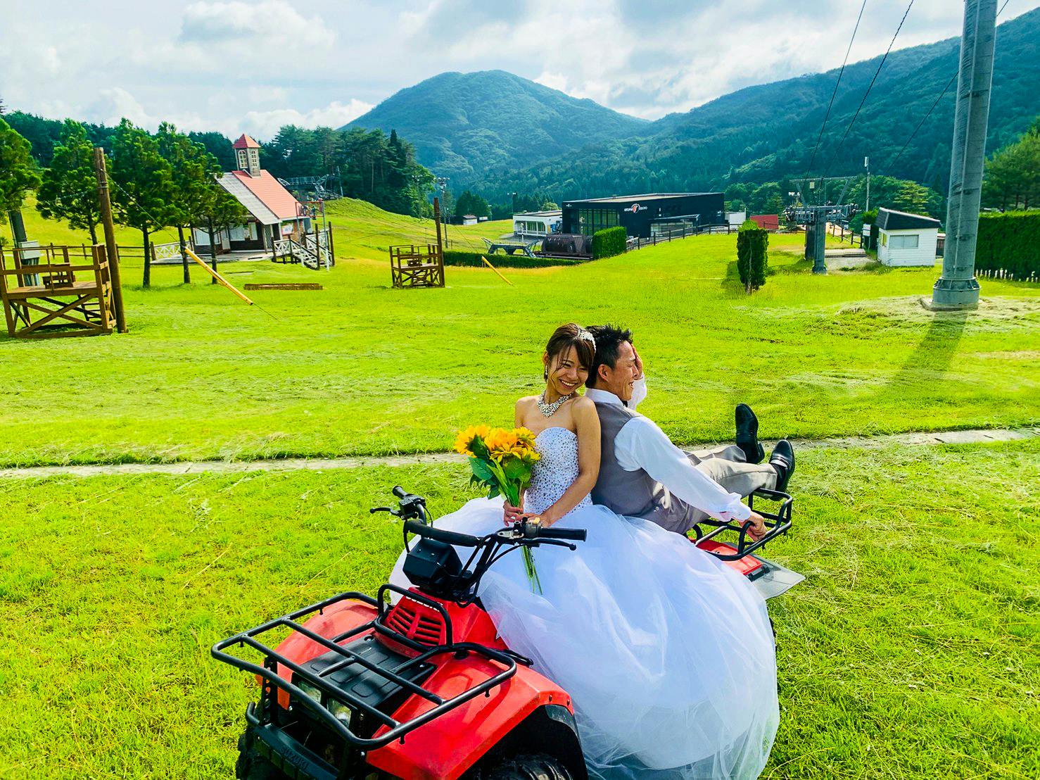冬はスキー場なので、雪が舞う中でのホワイトウエディングはよく目にするのですが、大自然の緑に囲まれたフォトウェディングも緑の芝生がインスタ映えする!ということに気づきました。新婚カップルだけでなく、2人の記念日(付き合って1年!など)、家族写真、大学最後の夏!など色んなパターンの思い出作りにもおすすめです!