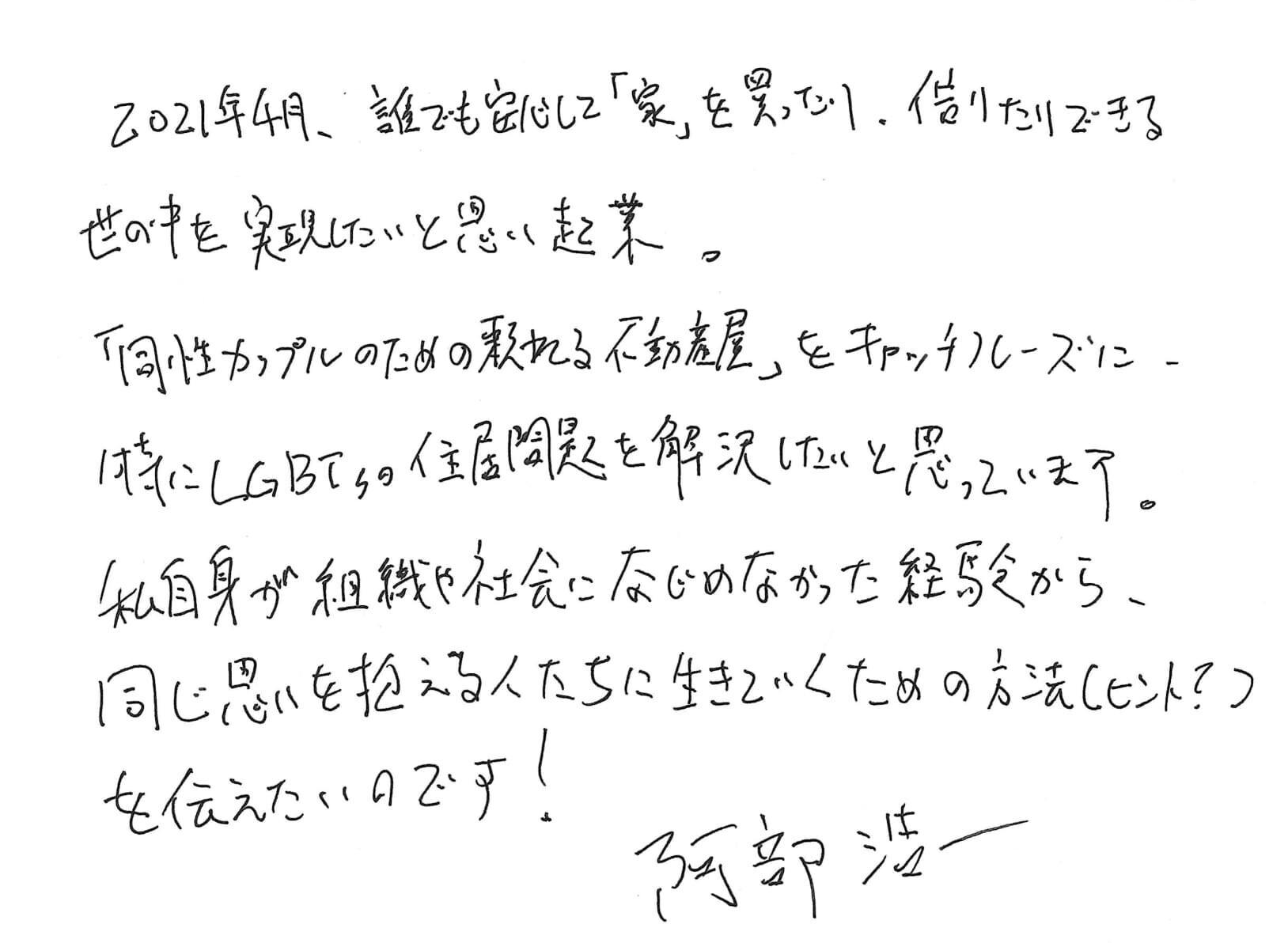 組織に属することが苦手で「同性カップルのための頼れる不動産屋」をひとりで起業し、ゲイの当事者でもある私の経験や考え方が、まだ出会えない誰かに届き、何かしらの役に立てるとしたら、これほどの喜びはありません。