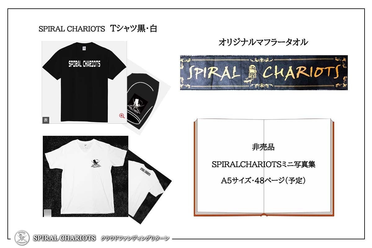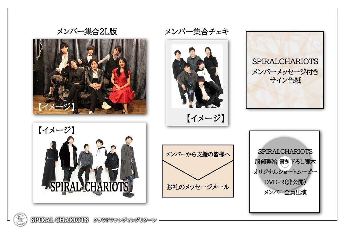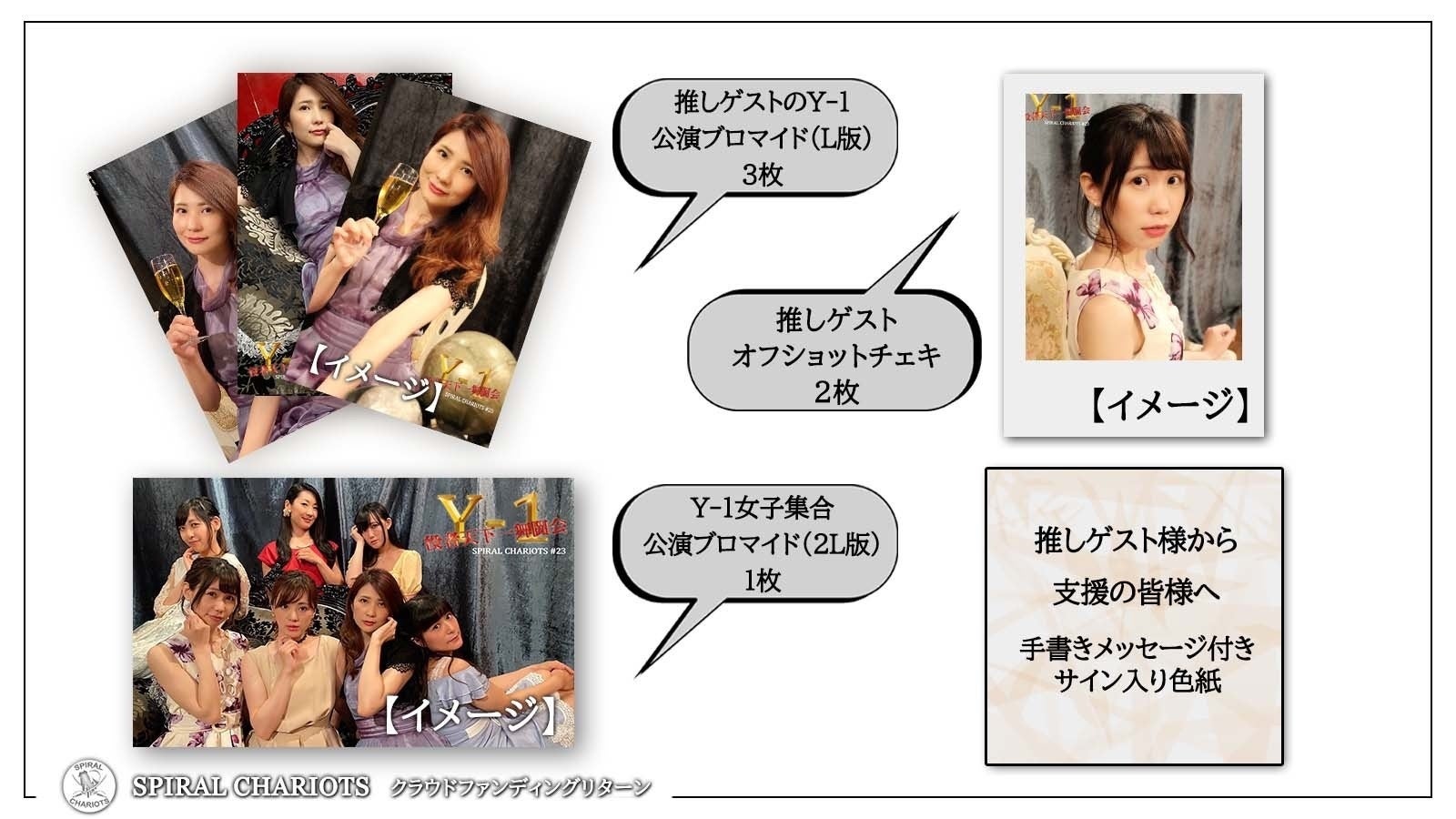 SPIRAL CHARIOTSのお礼を込めたメッセージや、チェキ、ブロマイド、Tシャツなどのグッズをはじめとし、『役者天下一舞闘会 Y-1』出演キャストのブロマイド、チェキなどをリターンとします。