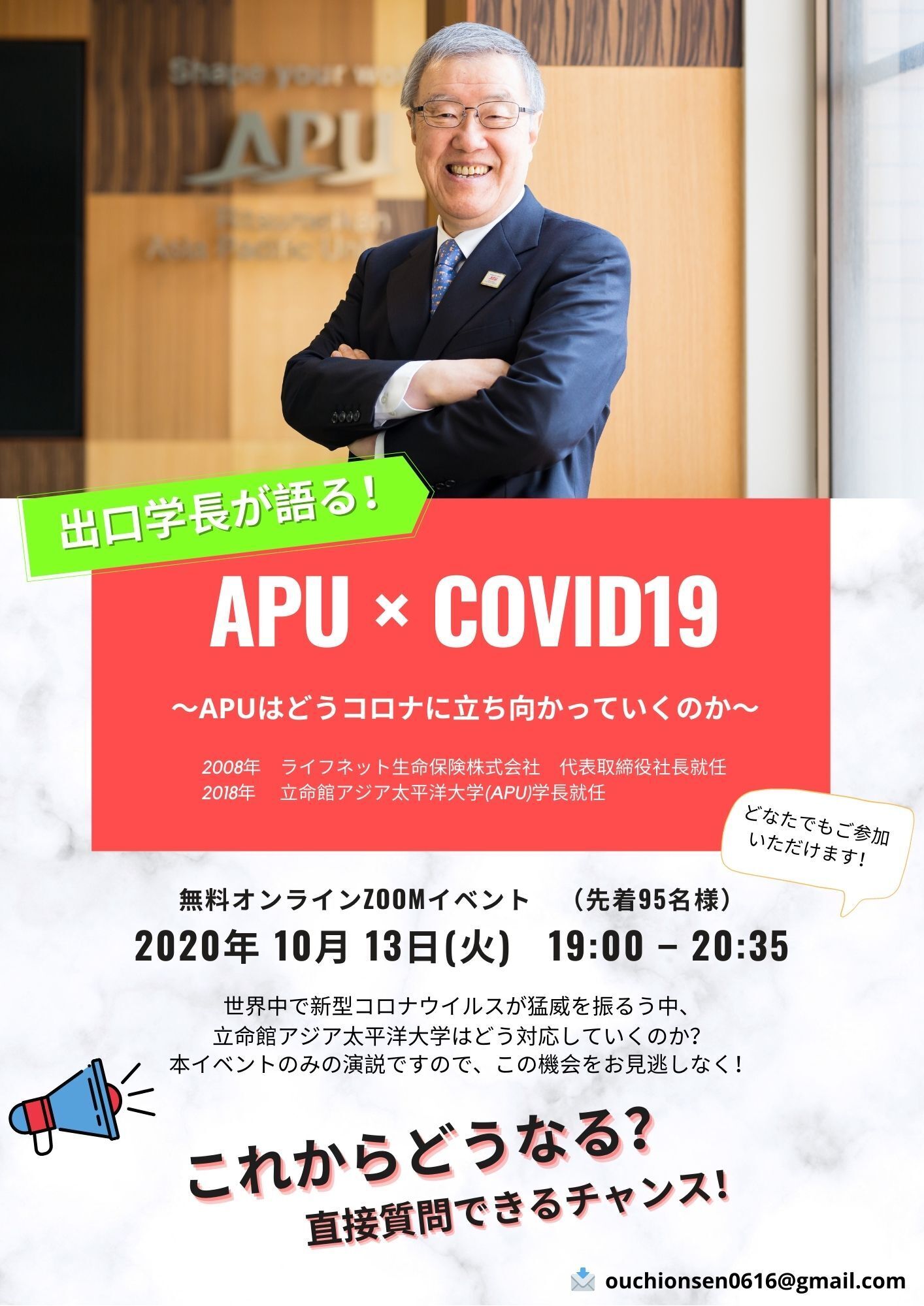 「世界的に新型コロナウイルスが広がる中で、立命館アジア太平洋大学(APU)はどう対応していくのか?」出口学長をお招きし、これからのAPUの対応について演説してもらいます!