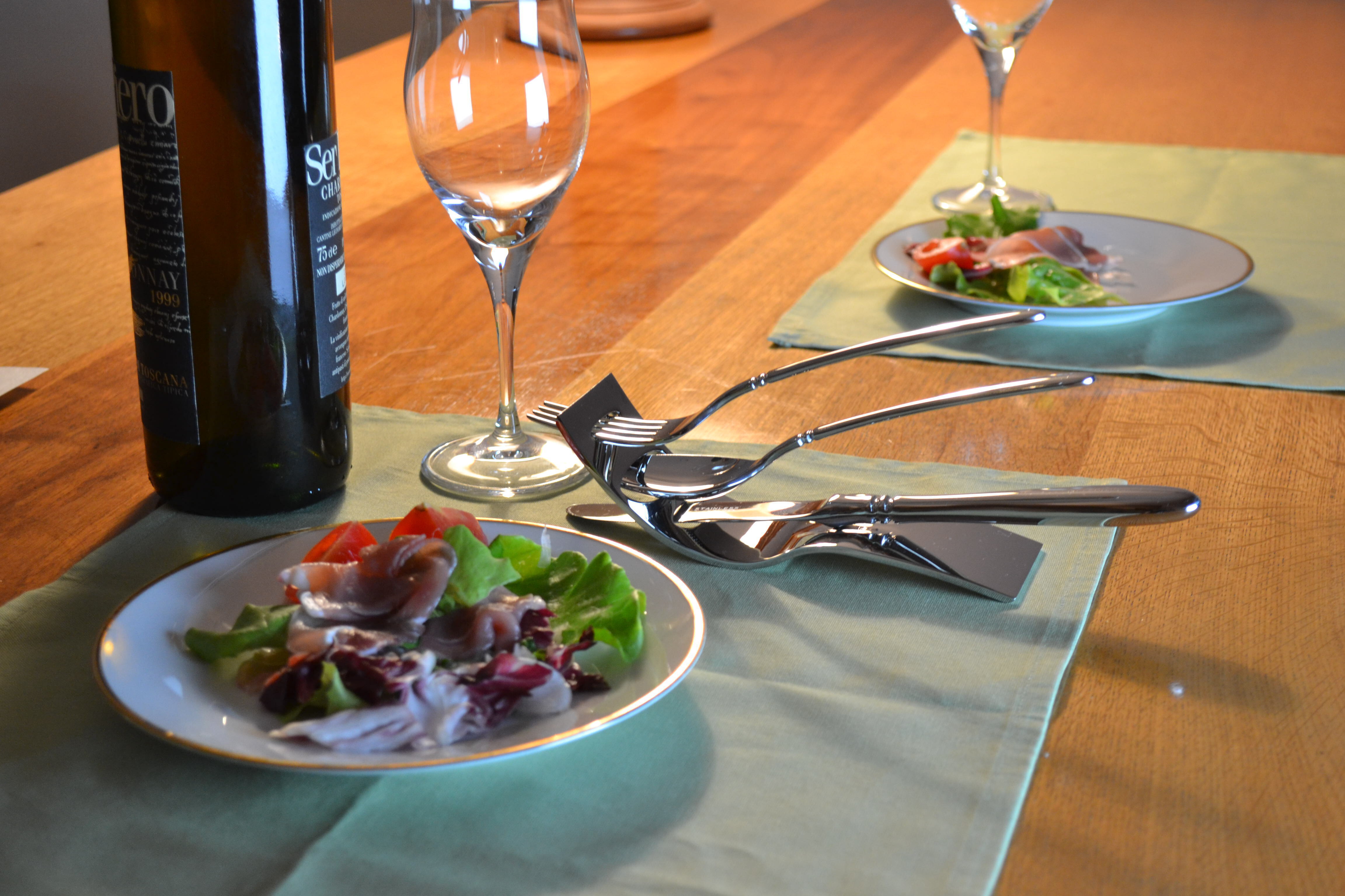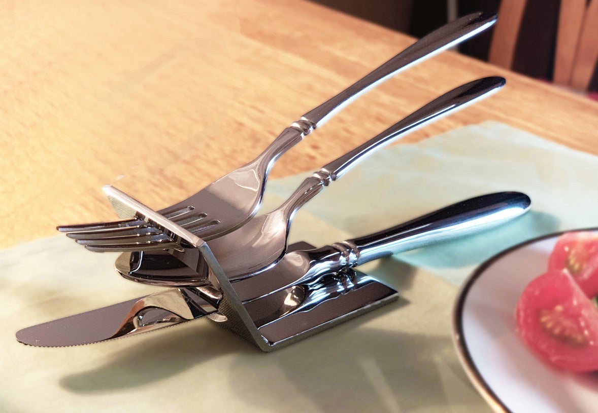 そもそも、なぜカトラリーは直置きなのか。テーブルクロスやランチョンマットは清潔なのか。毎回洗うなど、どう考えても普段使いに適さない。加えて、カトラリーの先がテーブルにつかない方が気持ちが良いのではないかと考えました。