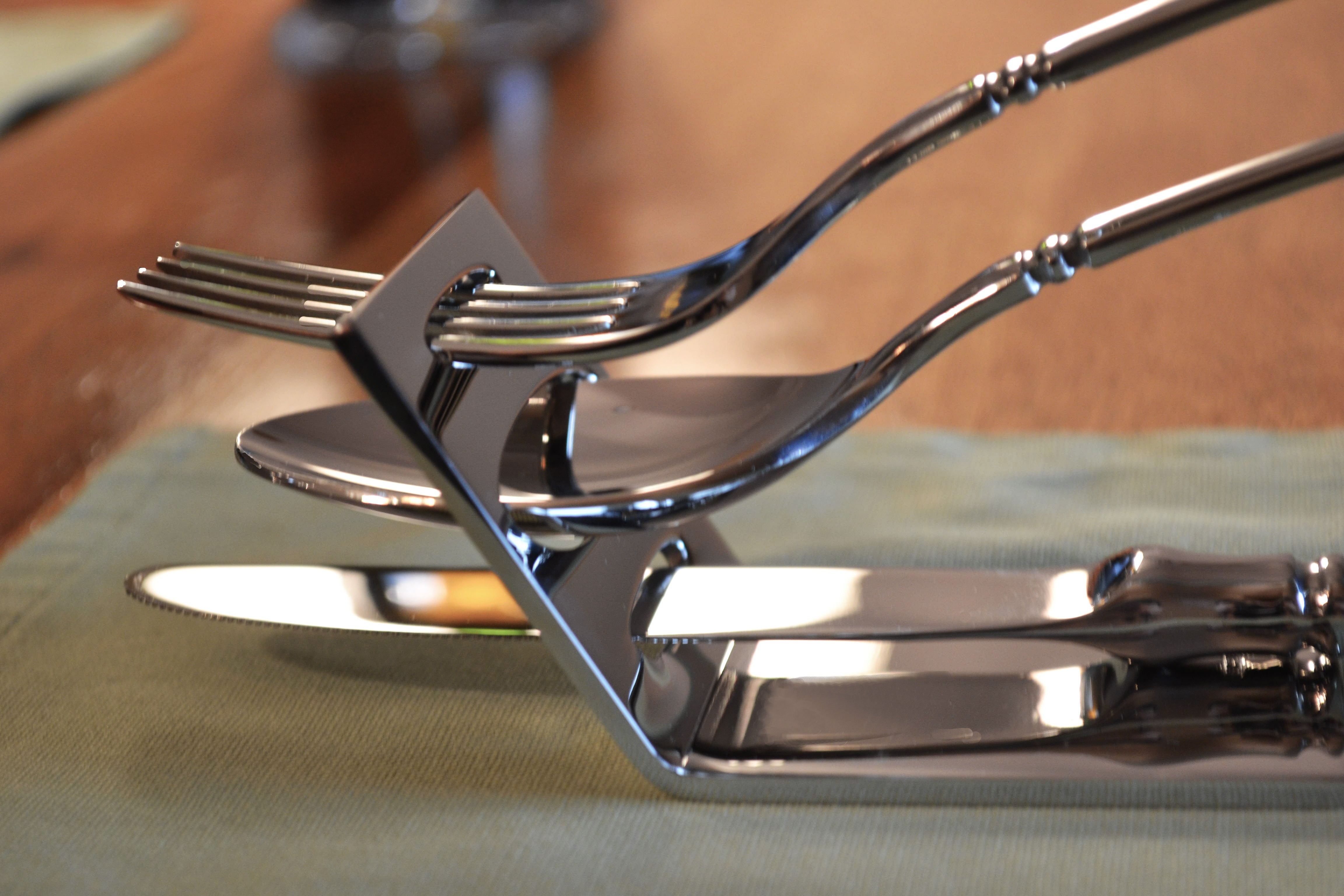 一般的に箸には箸置きを使います。近年、それを流用したような「カトラリー置き」なるものにスプーン、フォークをずらずらっとがん首揃えている様を見かけますが、どうも格好が悪い。