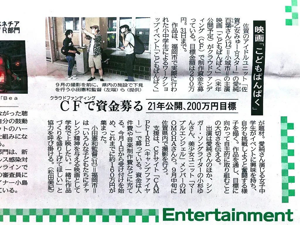 映画『こどもばんぱく』製作の事が 昨日のネット版 佐賀新聞ニュースに続いて今朝の佐賀新聞の誌面にも掲載されました!