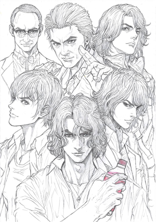 こちらの絵を清書、彩色した複製画(A3サイズ)に6名(高野八誠、青柳尊哉、吉岡毅志、須賀貴匡、大葉健二、島津健太郎)のサインを付けてリターンさせて頂きます。