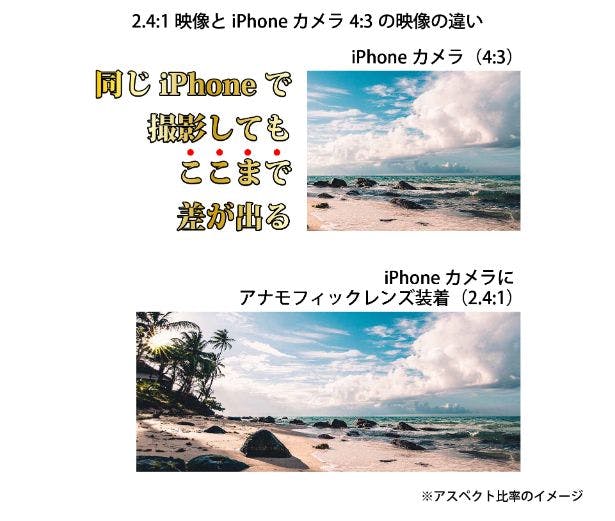 スマホのカメラに取付けるだけで2.4:1のシネマサイズのプロ仕様の動画や画像が簡単に撮影できます。