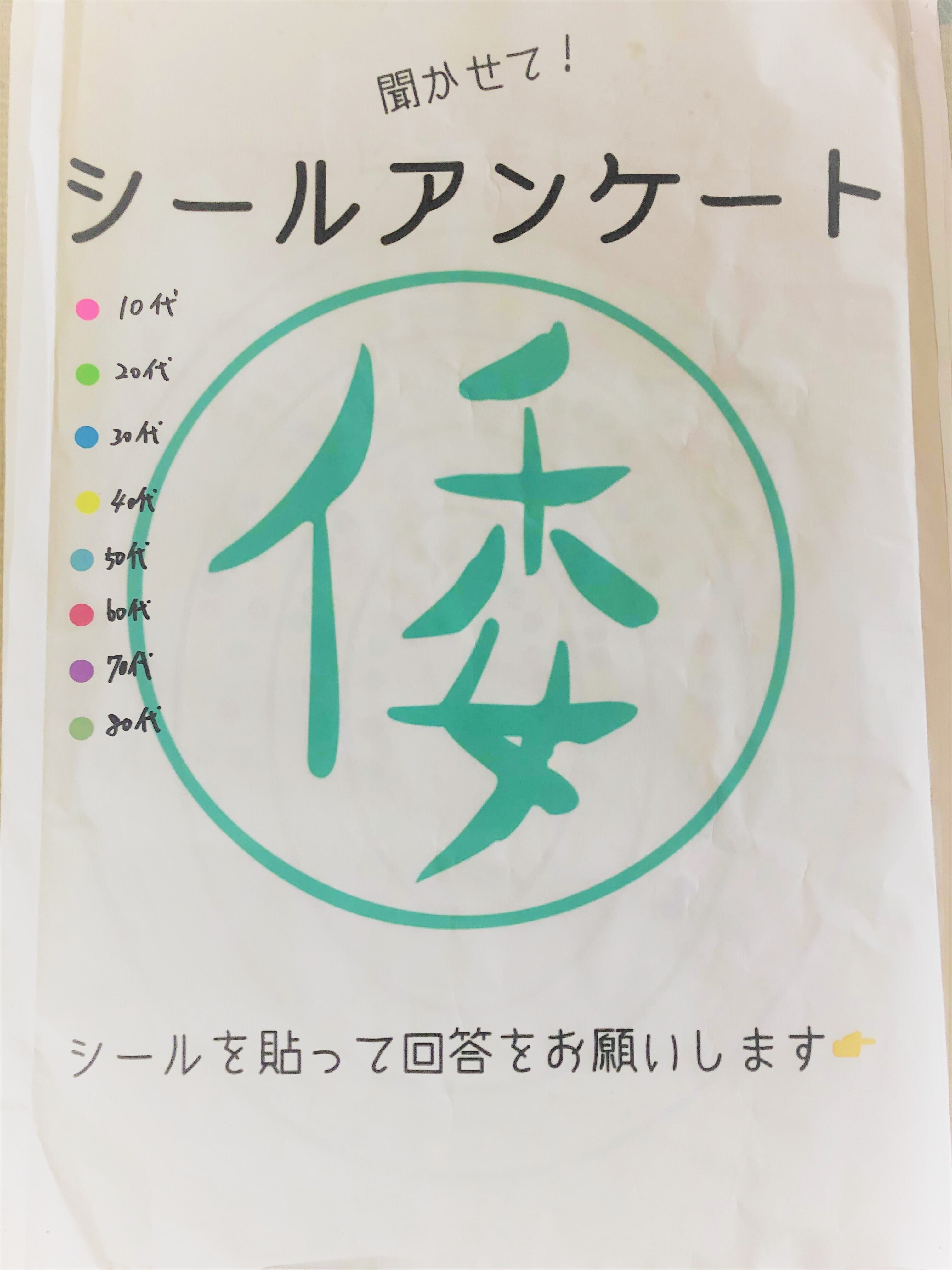 チャリティー市期間中2日間にわたって、この建物でどんなワークショップがあれば参加したいですか?というアンケートをシールを使って行っていました。*シールの色が年齢を表しています。アンケートに答えてくれたのは合計138人、年齢別の内訳は、10代 17人20代 13人30代 20人40代 30人50代 17人60代 16人70代 12人80代 10人でした。40代を中心に、きれいにばらけました。47種類の健康・文化・衣・食・住にまつわるワークショップ例から複数回答で選んでいただいた結果、1番人気は、::多世代に人気の::☆陶芸☆の17票でした!!2番は、同一票の:::ヨガと洋菓子(ゴロがいいですね~)で、13票でした。その他の結果はこちらこの結果を参考に、なるべく多世代がまじり合うテーマのワークショップを開催していきたいなぁと思っています。また、このデータを見て、ぜひ、私が〇〇の講師をやってみたいという方などがいたらメッセージを下さい。今後もデータを集めるべく、様々な場面でアンケートを行っていこうと思っていますので、ご協力をお願いします。倉田 麻里