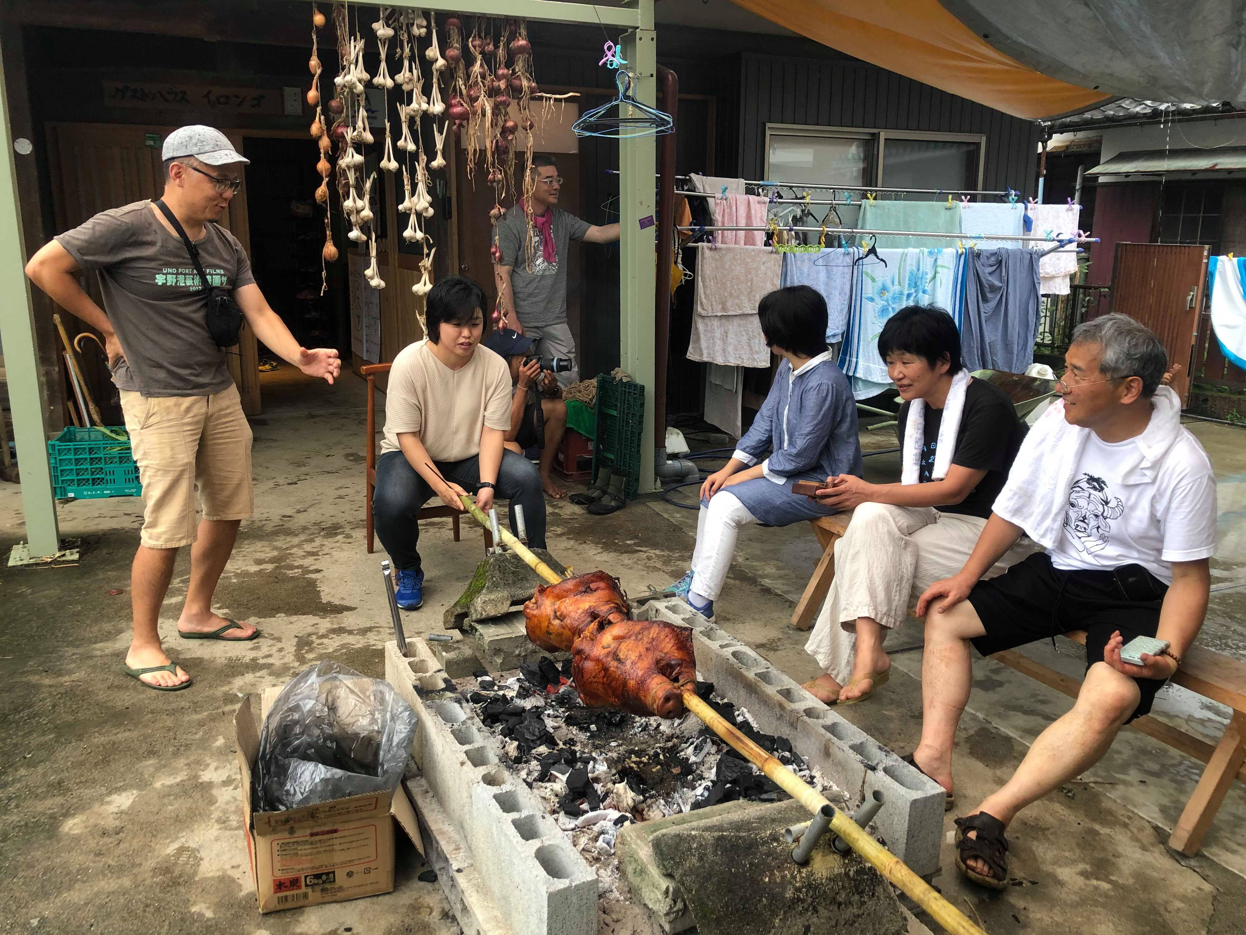 本日、ゲストハウスイロンゴでチャリティー市の反省会を開催しました。3密を避け、20人くらいの協力者、出演者、出展者が集まりました。目玉は、豚の頭の丸焼きです。リターンには、鳥の丸焼きとイノシシの丸焼きがありますが、今回は豚の頭の丸焼きでした。朝8:00頃から焼き始めて、焼きあがったのは12:30。4~5時間炭の上で棒をまわしながらじっくりと焼きます。晴れていたら、庭に机を出して、焼きながら飲み始めることもできるのですが、あいにくの雨だったので、反省会は室内で。反省会では、「チャリティー市でこれほどの反響を得られたのは大収穫だった。」(協力者)「ホールを使ったコンサートなどのリターンが欲しい」(参加者)「倭村でいろいろなつながりが作れそうなので、リターンとして協力させてほしい」(出演者)などのお話がありました。そこで、本日、新しいリターンを申請しました。3,000円 消しゴムはんこで作った旧倭村役場オリジナル手ぬぐい2枚セット5,000円 ピアニスト大谷清文とのミュージックセッション参加券 8,000円 プレオープン期間中の1日イベント開催権30,000円 あなただけのための天才ピアニスト伊東朔コンサート招待券(1組5名様程度まで) 承認されるまでに、しばらく時間がかかりますので、ご希望の方はメッセージでお知らせください。掲載され次第ご案内します。限定個数がありますので、お早めにお願いします。倉田麻里Mari Kurata