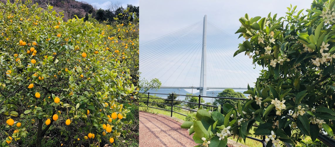 しまなみ海道とその途中にあるレモン畑 右にあるのはレモンの花です(5月ごろ)