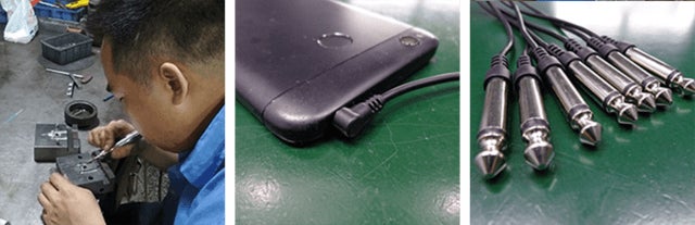 デバイスの内部に入るプラグ内のワイヤーをはんだ付けしています。この部分は絶えず一般のものと比べ動きが少ないため、比較テストの結果10倍の強度を可能にしました。