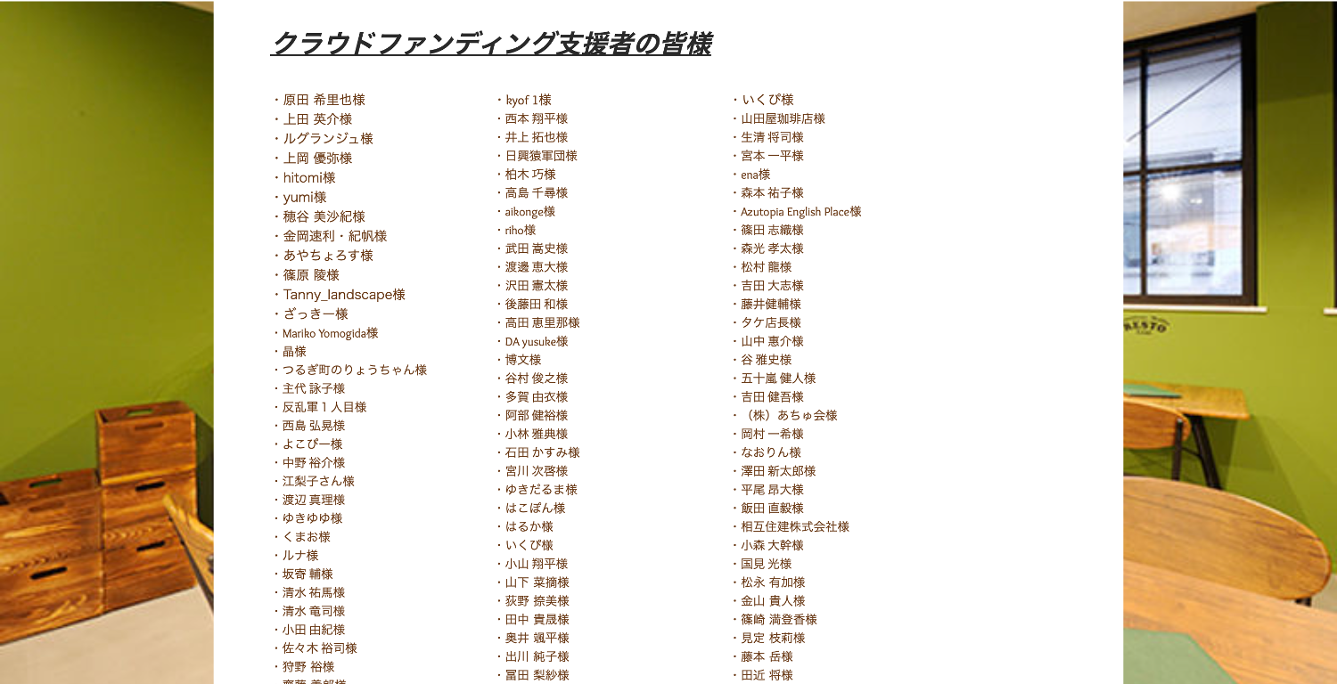 ご支援者の皆様、お久しぶりです!!American Waffle RESTO KOBEの川原です!!皆様お元気にお過ごしでしょうか?今回2つお知らせがございますので、最後までお読みくださいませ。①最後のリターン実行のお知らせ最後のリターンの【新店舗「American Waffle RESTO KOBE」にあなたのお名前を! 】 ※ご支援への感謝の気持ちを込めて、新店舗「American Waffle RESTO KOBE」の店舗内もしくはホームページにお名前を残させていただきます!」をずっと遂行できておらず、オープンしてから半年が経過してしまいました。大変申し訳ございませんでした。オープンしてから少しずつ作業をしていて、ようやく自分自身でHPを作ることができました!!クオリティは非常にしょぼいのですが、、、、笑HP内に掲載了承をいただいている方のみではございますが、ご支援者のお名前を掲載させていただいております!!こちらのURLをクリックしていただき、3つの項目の中の【About us】へ飛んでいただけるとご覧いただけます!!https://kawaharayu0821.wixsite.com/restokobeお待たせしてしまい、本当に申し訳ございませんでした。②2回目のクラファンプロジェクトをスタートしました!!!もうこれに関しては本当にスタートさせるべきなのか、本当に悩んでいたのですが、皆様に笑われるかも・バカにされるかもしれないと思ったのですが、勇気を出して、スタートしました!!https://camp-fire.jp/projects/view/453052こちらのURLからご覧いただけます!僕の考え・想いは新しいプロジェクト内に記載させていただいておりますので、もしご賛同いただける方は、ご支援いただけると本当に嬉しいです。これからもしっかりと神戸を代表するカフェとして、コロナに立ち向かいながら明るく元気に営業していきますので、どうぞ今後とも当店をよろしくお願い致します。最後までお読みいただき、ありがとうございました。American Waffle RESTO KOBE川原 悠LINE : bit.ly/3kba8CYInstagram:@restokobeTwitter:@restokobeTik Tok : https://www.tiktok.com/@yu99darts?lang=ja-JPRESTO KOBE HP : https://kawaharayu0821.wixsite.com/restokobeFacebook:https://www.facebook.com/restokobenote(ブログ):https://note.com/restokobeYoutube : https://www.youtube.com/channel/UCisIdF2xyHdsHn2qikaYjOA