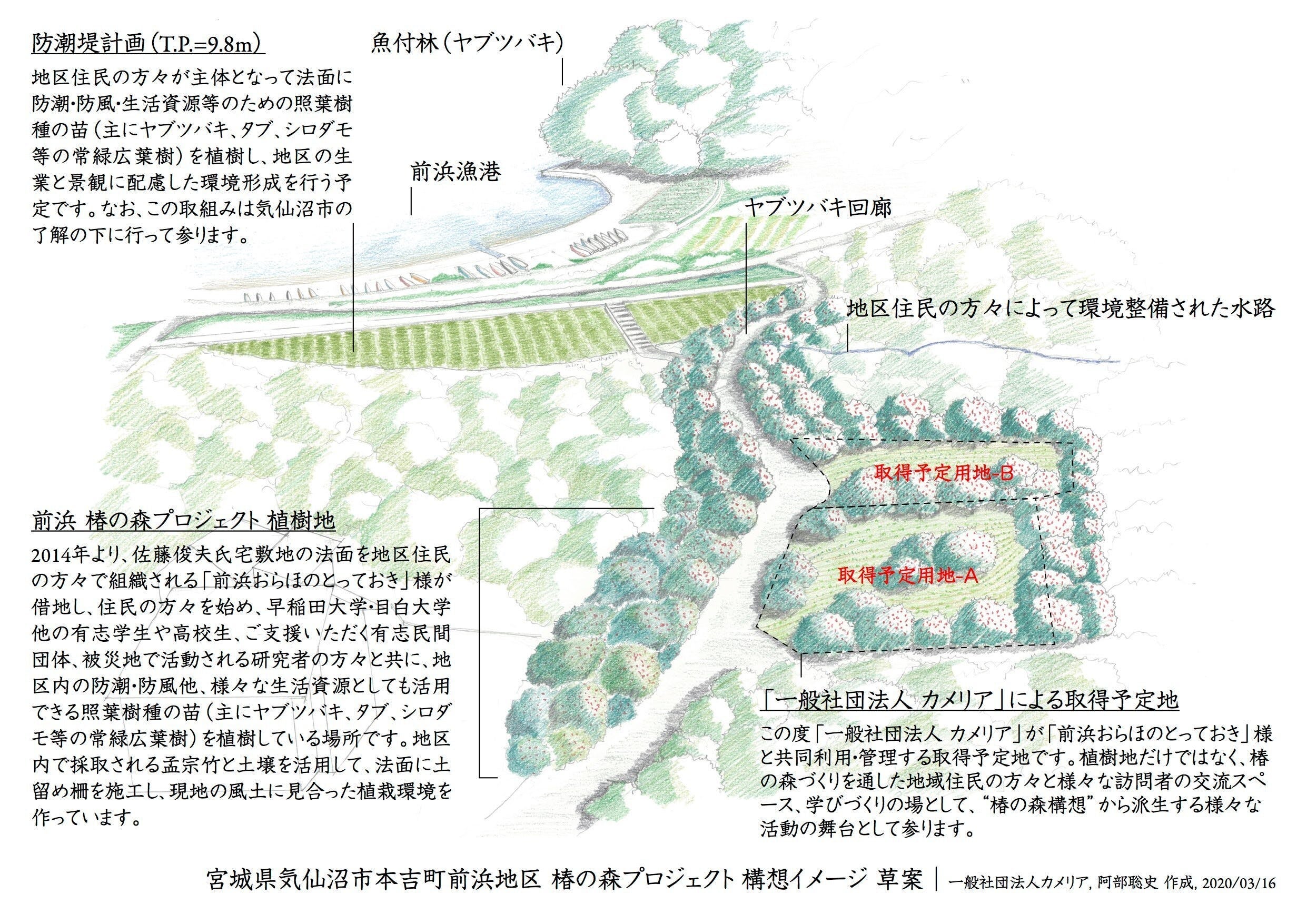 今回、これまで植樹してきた隣の場所がソーラーパネルの用地として売られると聞き、売主や業者の方とも相談させていただいた結果、ここを植樹活動の一部とさせていただくことになりました。津波が浸水した土地(宅地と農地合わせて約300坪)を買い取り、「椿の森づくり」の拠点としたいと思います。