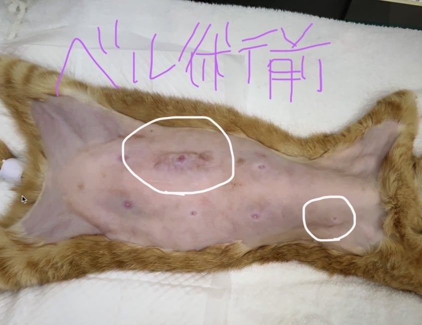 1枚目は手術前に毛を剃った後の画像です。大きい◯部分が腫瘍です。小さい◯が手術直前で新たに見つかった腫瘍です。大きい腫瘍の方は片側全摘出して小さい方は部分だけの摘出になりました。ですが病理検査の結果によってはもう片方も全摘出しなければなりません。