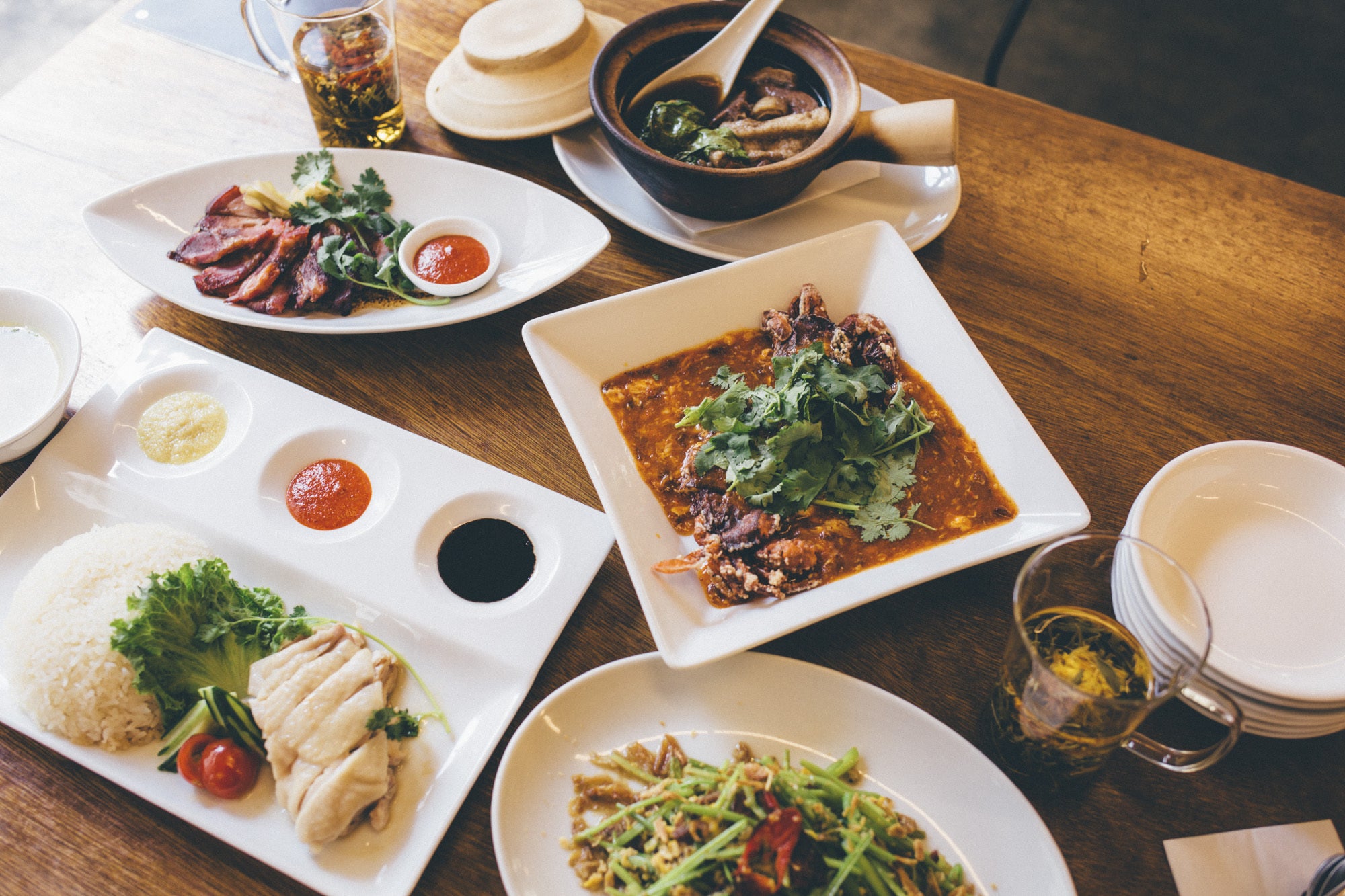 チキンライスをはじめとしたシンガポール料理の数々。タイガービールや、きりっと白ワインを合わせては。