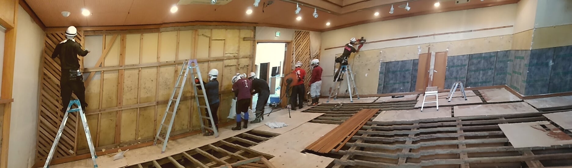 音楽ホールの命の一つともいえる壁の一部撤去をし、二重三重にもなっている壁の中にある吸音材や遮音シートがどの程度湿気が残っているか、カビの発生はないかを確認している作業です。幸いにもあまり濡れていなければそのまま乾燥しますが、湿気が多くカビが発生している状況となれば、吸音材、遮音シート等を撤去し新しいものと入れ替えて復旧しなければなりません。