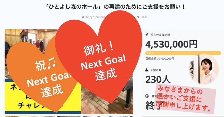 60日間、周囲の方々のご協力を得ながら進めてきたクラウドファンディングでしたが、お陰様で当初目標はもちろんネクストゴール450万円も達成することができました。誠にありがとうございました。皆様からのご支援がどんなにか力になったことか。改めて心から感謝申し上げます。