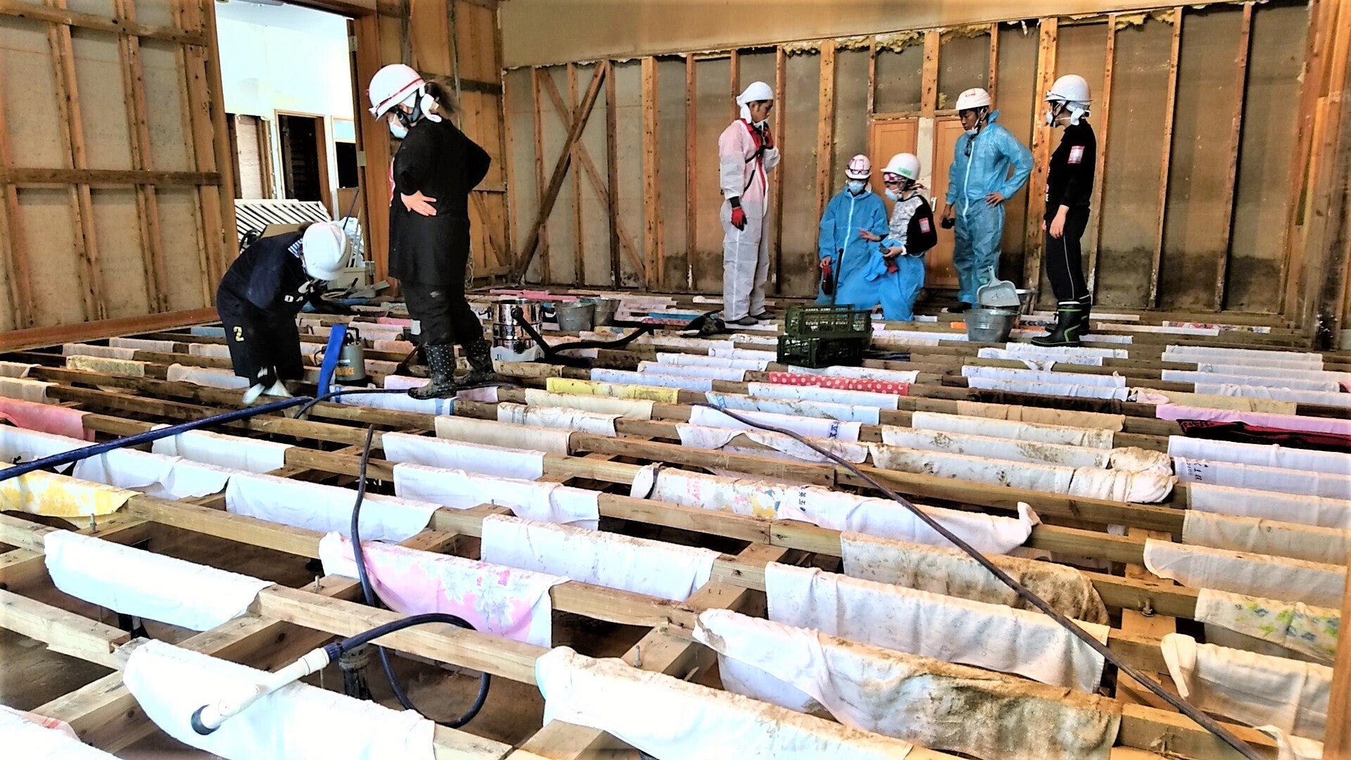 ホール内床下の乾燥には、時間がかかります。タオルは、床下に溜まった泥を撤去した後に残った水分を除去するために使用しております。 大型扇風機と送風管を夜間もぶっ通しで稼働して乾燥しなければなりません。ホールの奥にある控室の床と壁は、ホール内の乾燥をしている間に、スケルトン状態にしてホールに先行して仕上げていく予定です。画像キャプション
