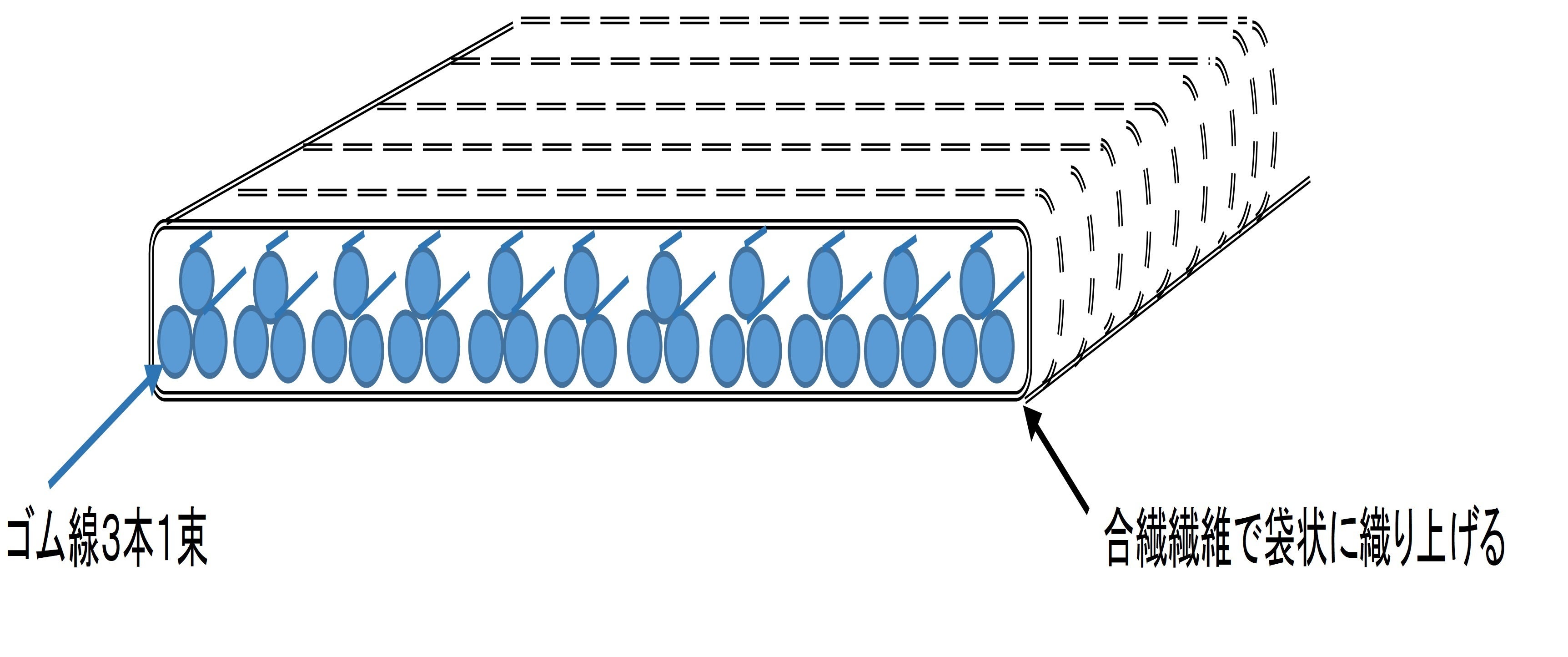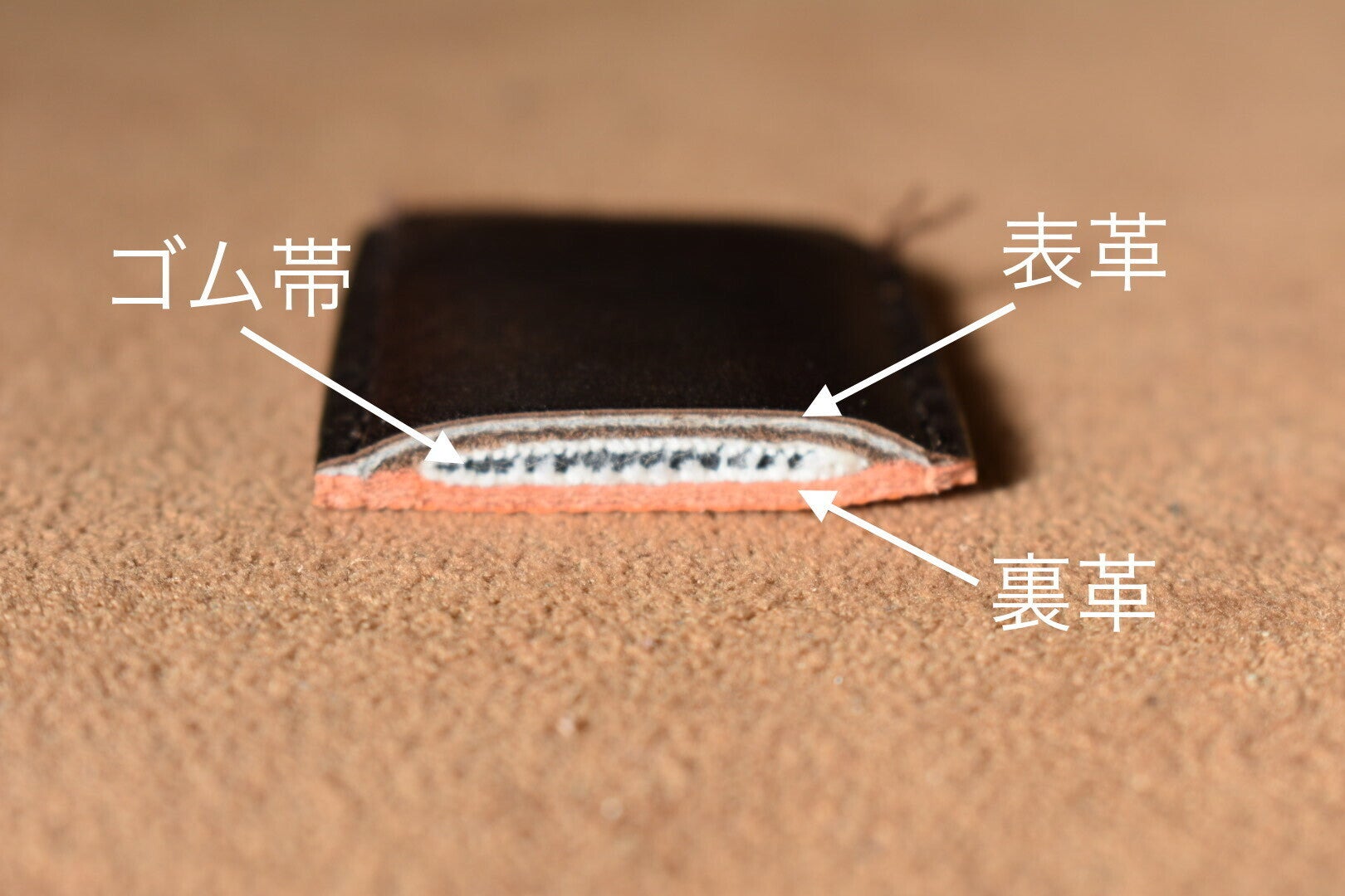 表面と裏面は本革を使用し、中心の心材にはゴム帯を使用した3層構造です。中心のゴム帯には「袋織ゴム」と呼ばれる耐久性に優れる芯材を採用しました。このゴム帯は直径0.5mmほどのゴム線を3本一束に11束を一列に並べており、複数のゴム線によって伸びた後もしっかりと元の長さへ戻すことを可能にしています。