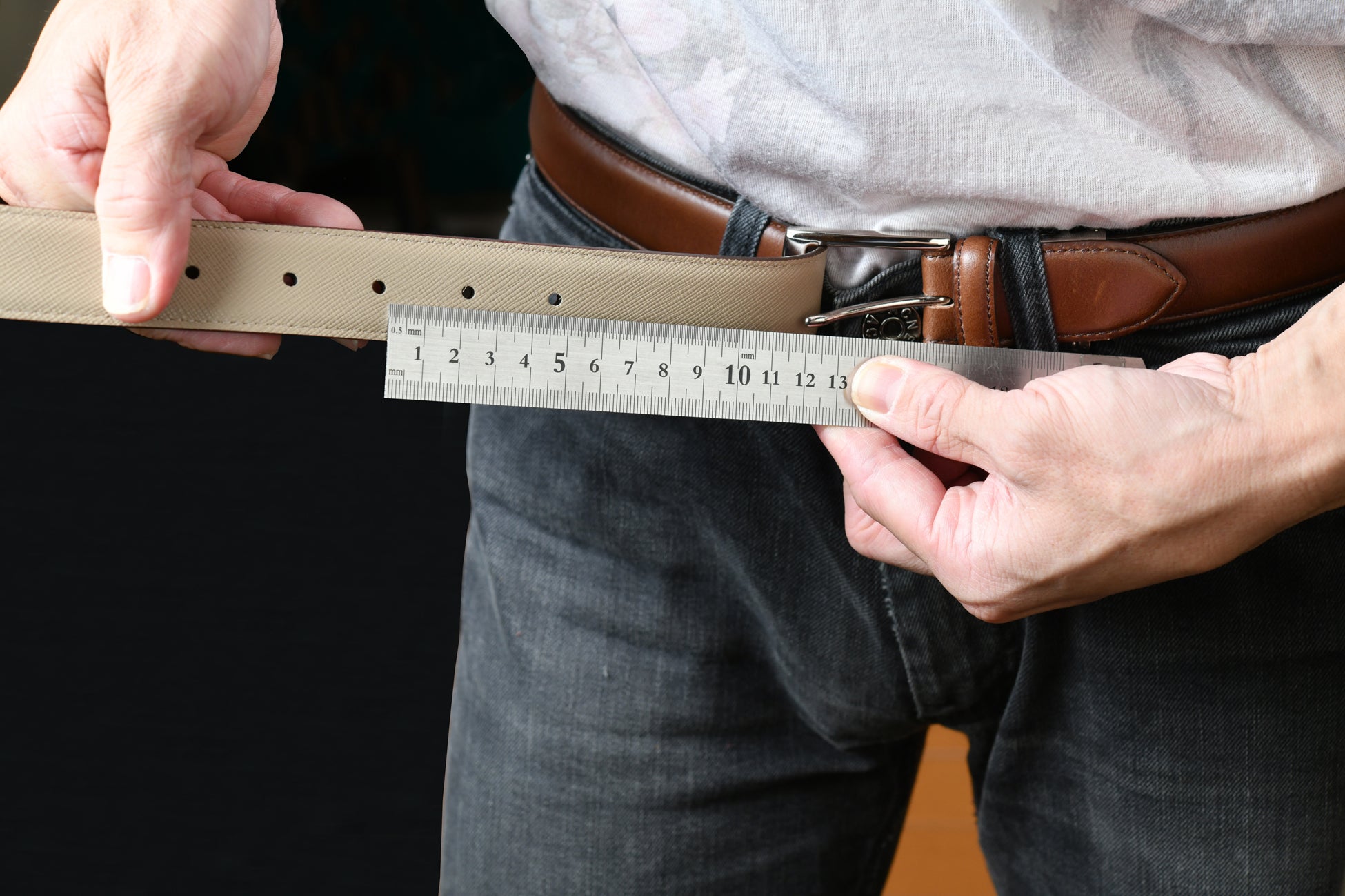 1、ベルトを装着してベストな穴位置を確認し中心穴位置までの長さを測る