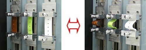 着用中や脱着等で繰り返し屈曲を想定した耐屈曲性試験。この試験は<低速疲労試験>とは逆に帯を縮ませる(屈曲)ことで亀裂を検証できる試験です。15cmのベルト帯をデマッチャ式伸縮疲労試験機を用いて屈曲操作を1分間に60回繰返します。(ボーケン法)