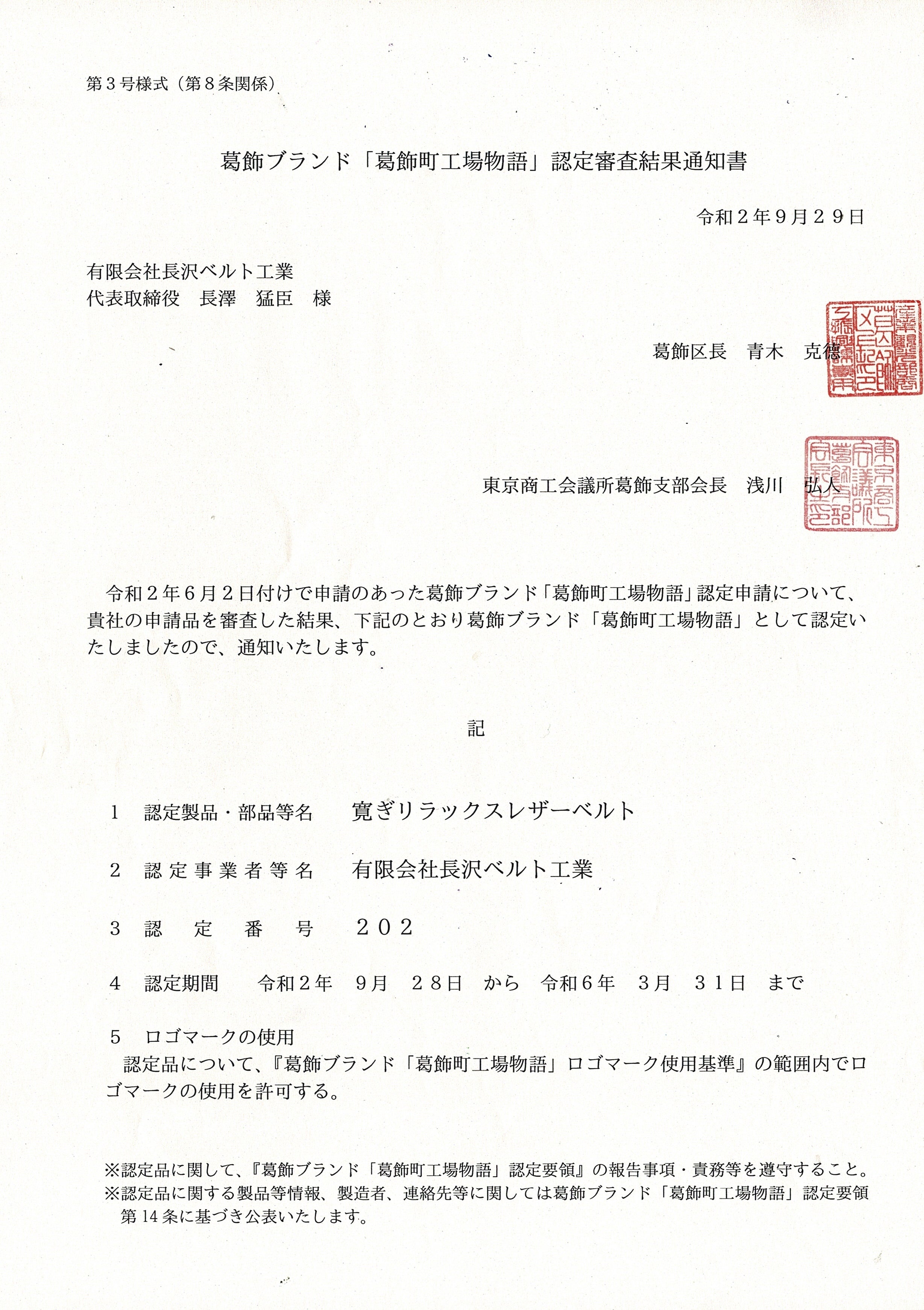<本革で8cm伸びる究極寛ぎベルト>が認められ東京都葛飾区の【葛飾ブランド】に認定されました!