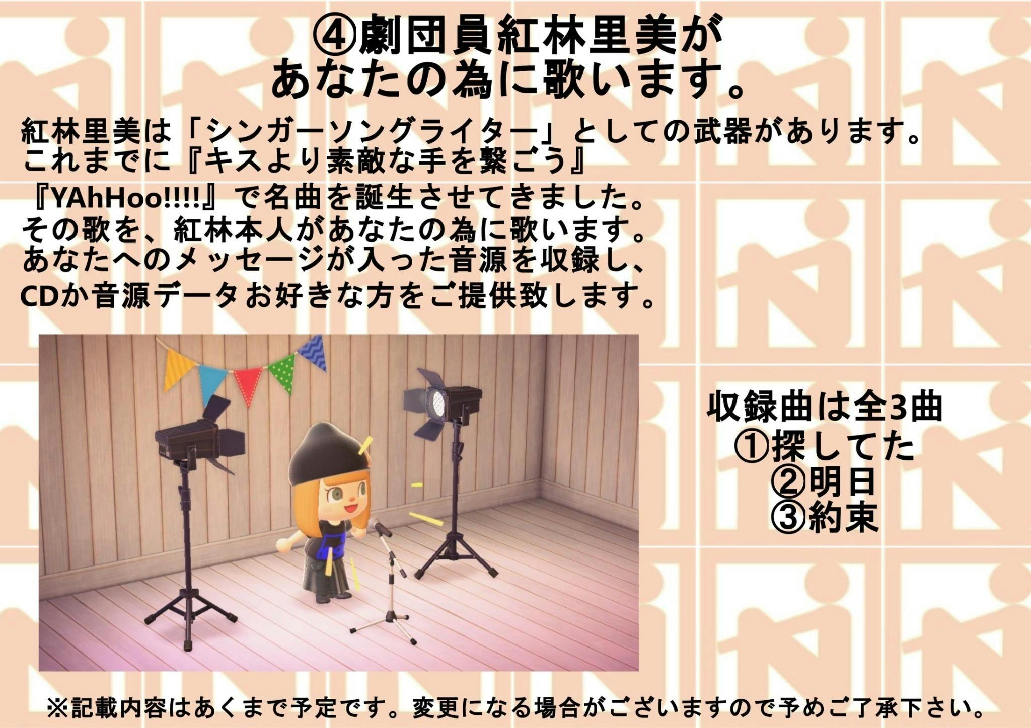 2020/09/26 09:15ナイスコンプレックス劇団員のそれぞれの武器を活かして、リターンを考えました。劇団員紅林里美。ナイコンの次女。通称くれば。ナイコンで一番社会人で、一番酔っ払います笑楽しい事が大好きで、じっと見据えてナイコンを支えてくれています。紅林里美は「シンガーソングライター」としての武器があります。これまでに『キスより素敵な手を繋ごう』『YAhHoo!!!!』で名曲を誕生させてきました。その歌を、紅林本人があなたの為に歌います。収録曲は全3曲①探してた(『キスより素敵な手を繋ごう』OP曲)サンプル → 探してたサンプルver.mp3 ②明日 (『キスより素敵な手を繋ごう』ED曲)サンプル → 明日サンプルver.mp3 ③約束 (『キスより素敵な手を繋ごう』挿入曲)サンプル → 約束サンプルver.mp3 今回ご支援頂いたあなたへのお礼メッセージと上記の3曲を今回用に歌った音源を収録し、CDか音源データお好きな方をご提供致します。 もっと見る