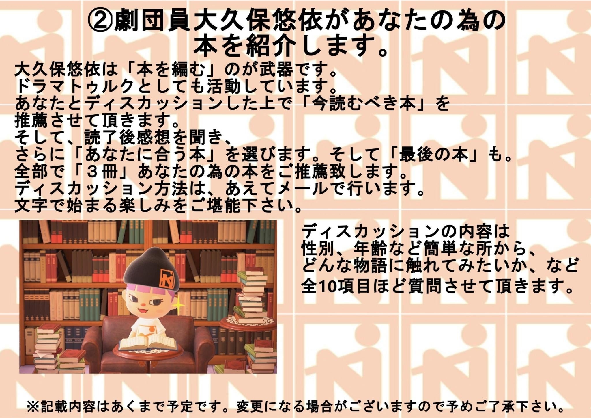 ナイスコンプレックス劇団員のそれぞれの武器を活かして、リターンを考えました。劇団員大久保悠依。初めてナイコンに出演したのは20歳の時、もう10年以上経ちました。生意気な娘が今は生意気な女性になりました笑ナイコン愛が人一番強い人間です。大久保悠依は「本を編む」のが武器です。悠依は本を読むのが物凄く早いです。それはこれまで読んできた本の数を聞いて納得しました。「年間150冊」恐らく昔は本が友達だったのでしょう。物語の中から色んな事を得てきたのでしょう。そんな悠依は、現在ドラマトゥルクとしても活動しています。本や物語をつくる人、「本を編む」人間となっています。今回の企画は、支援者様とディスカッションした上で「あなたが今読むべき本」を推薦させて頂きます。そして、読了後感想を聞き、さらに「あなたに合う本」を選びます。そして「最後の本」も。全部で「3冊」あなたの為の本をご推薦致します。ディスカッション方法は、あえてメールで行います。文字で始まる楽しみをご堪能下さい。※ご注意点・本の購入はご自身でお願い致します。・是非、3冊を最後まで読んで下さい。