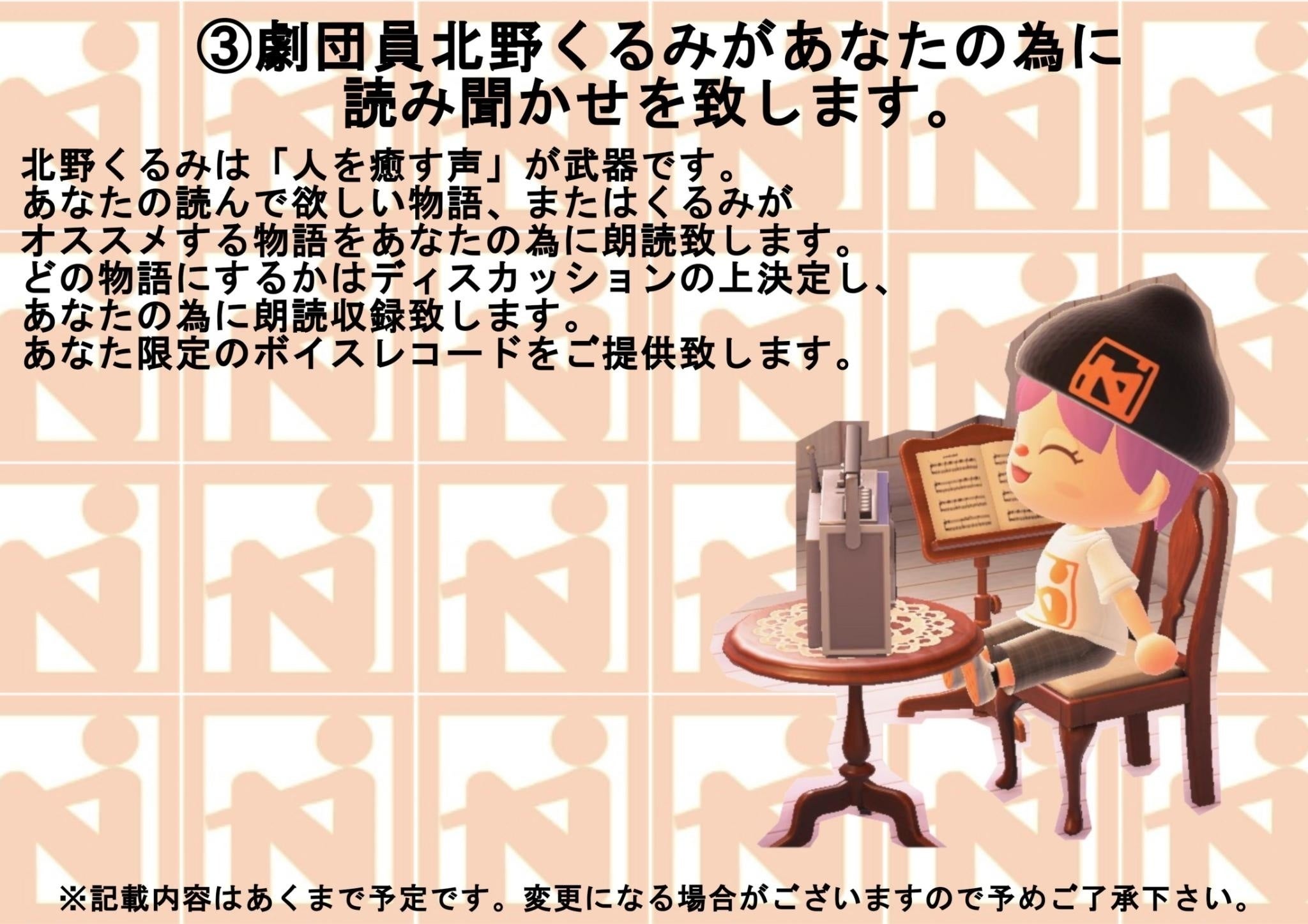 ナイスコンプレックス劇団員のそれぞれの武器を活かして、リターンを考えました。劇団員北野くるみ。2018年12月25日に劇団員となったくるみ。最年少ながら物凄く負けず嫌い。だからこそ現在いなくてはならない存在となっているんですね。北野くるみは「人を癒す声」が武器です。劇団に入った頃はその発声について色々話しました。そして一周回って気付いた事があります。くるみにはくるみしかない声がある。「誰でもそうでしょ?」って思われるかもしれませんが、それとは違います。波形にしたら分かりやすいと思うのですが。人間の琴線に響く声質なのです。(キムラ談)そのくるみが、あなたの読んで欲しい物語、またはくるみがオススメする物語を「あなたの為に朗読」致します。どの物語にするかはメールによるディスカッションの上決定し、あなたの為に朗読収録致します。あなた限定のボイスレコードをご提供致します。※ご注意点・読む物語の長さに関しましては、朗読時間は約15分程度を目安として、20分を超えてしまう場合は作中を一部抜粋等のご相談のうえ、収録させて頂く形にさせて頂きます。・公序良俗に反する内容、法令に違反する内容などはお受けできませんサンプルボイスです北野くるみ物語サンプルボイス20-09-20-03-33__1600540396.mp3