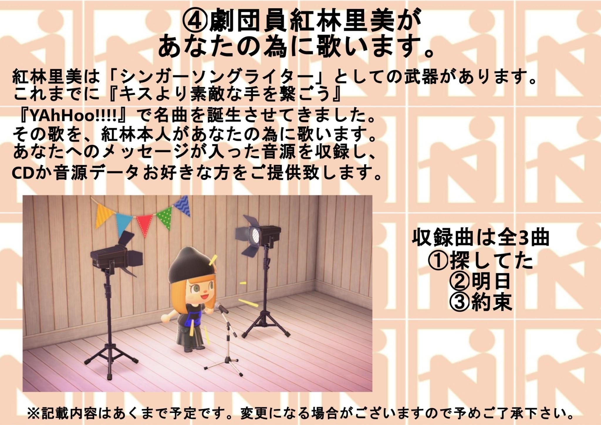 ナイスコンプレックス劇団員のそれぞれの武器を活かして、リターンを考えました。劇団員紅林里美。ナイコンの次女。通称くれば。ナイコンで一番社会人で、一番酔っ払います笑楽しい事が大好きで、じっと見据えてナイコンを支えてくれています。紅林里美は「シンガーソングライター」としての武器があります。これまでに『キスより素敵な手を繋ごう』『YAhHoo!!!!』で名曲を誕生させてきました。その歌を、紅林本人があなたの為に歌います。収録曲は全3曲①探してた(『キスより素敵な手を繋ごう』OP曲)サンプル → 探してたサンプルver.mp3 ②明日 (『キスより素敵な手を繋ごう』ED曲)サンプル → 明日サンプルver.mp3 ③約束 (『キスより素敵な手を繋ごう』挿入曲)サンプル → 約束サンプルver.mp3 今回ご支援頂いたあなたへのお礼メッセージと上記の3曲を今回用に歌った音源を収録し、CDか音源データお好きな方をご提供致します。