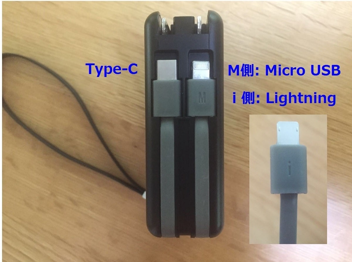 2本の接続ケーブルを内蔵しています。一本は、アンドロイドスマートフォン用Type-C。もう一本は、iPhone用Lightning 及び アンドロイド機、ガラケーで使用されているマイクロUSBです。片面づつ対応しており、面を変える事で充電ができます。↓ 以下の写真を参照下さい。