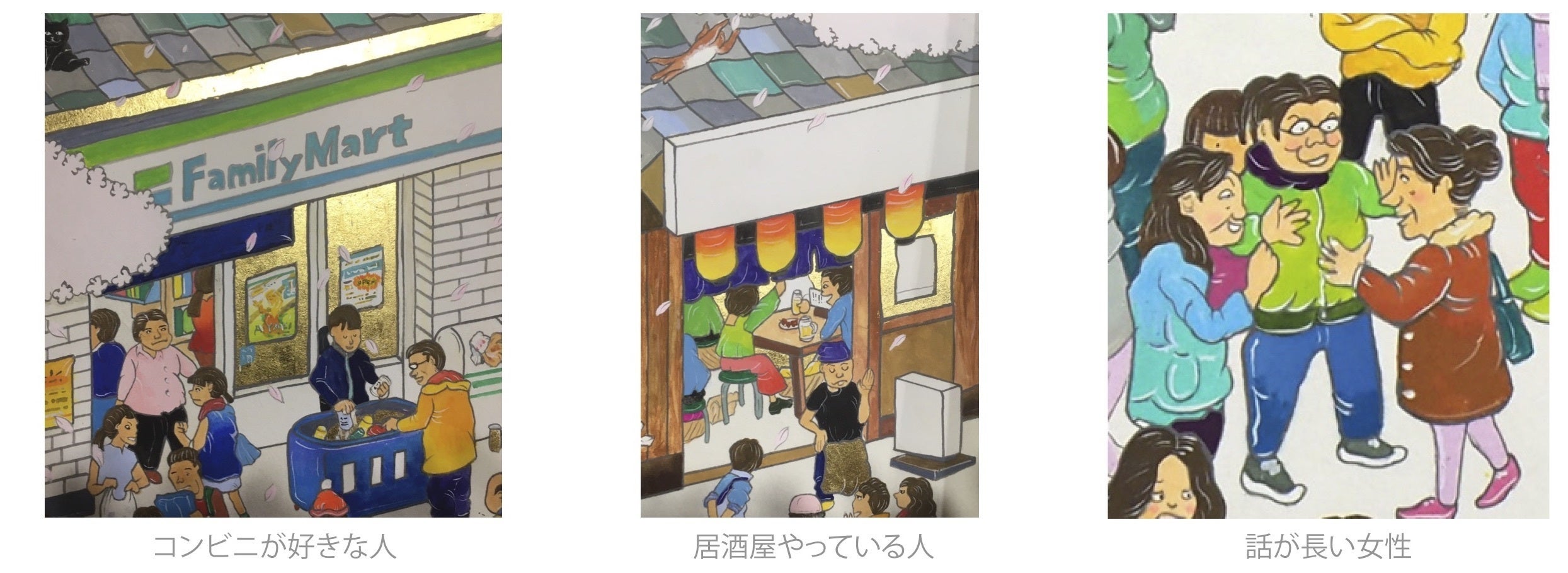 家族や友人や同僚など、周りに人がいるから自分がいる…そんな日常をあらためて感じて頂ければと願っています。私の描く風俗画の根底に流れている大切なものです。