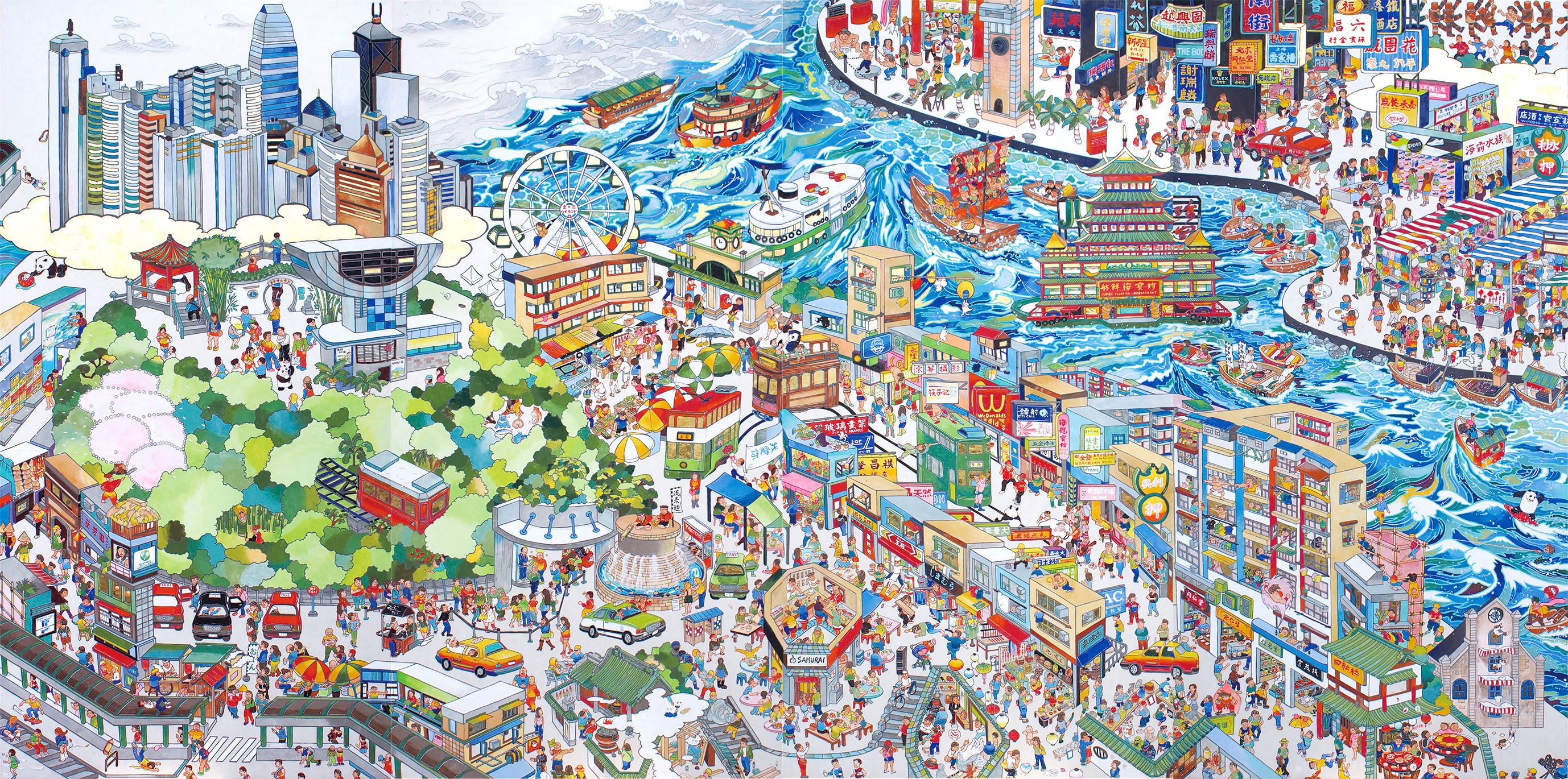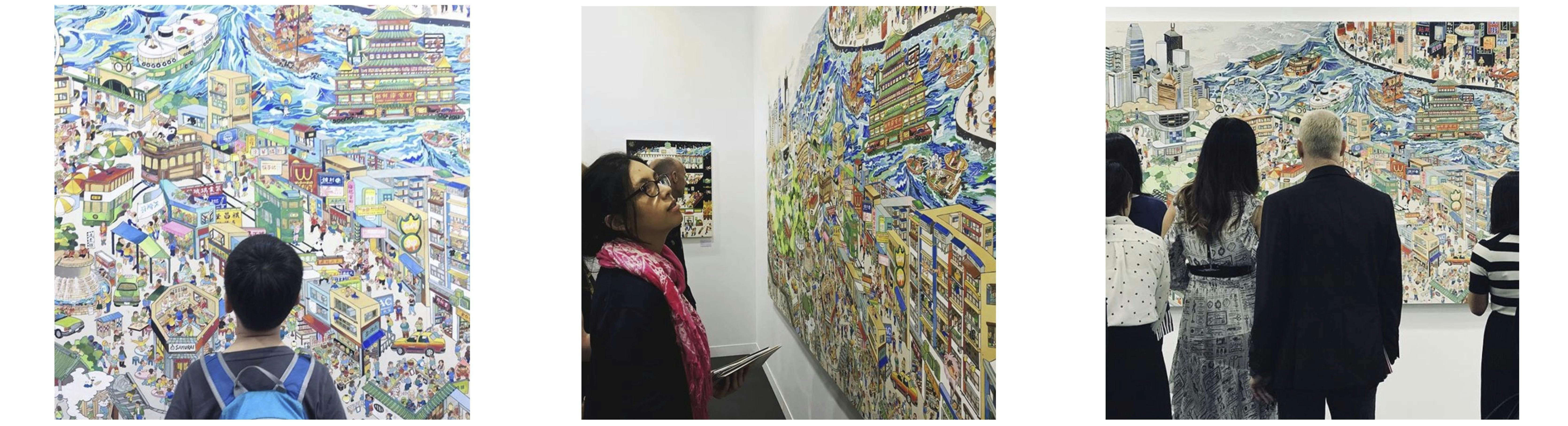 香港島をメインに描いた作品。高い建物と看板だらけのここでは、見上げた時に見える無数のマンションの窓やベランダが、住んでいる人々の様々な生活模様を想像させてくれました。